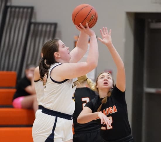 Crookston started the game on a 7-1 run behind three points from Halle Winjum, and two points each from Emma Gunderson and Libby Salentine. Libby’s basket gave Crookston a 7-1 lead five minutes into the game, and Salentine checked out of the game for a break. Within a couple of minutes, Menahga trailed 7-6. Salentine came back in the game, and Winjum scored five straight points to build a 12-6 lead halfway through the half. Menahga slowly chipped away at the deficit as Mackenzie Anderson got hot from downtown and made three three-pointers, and on her third make, she gave her team a 16-14 lead with 6:04 remaining in the half.