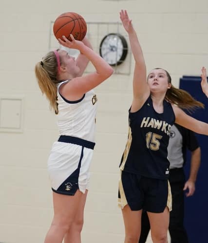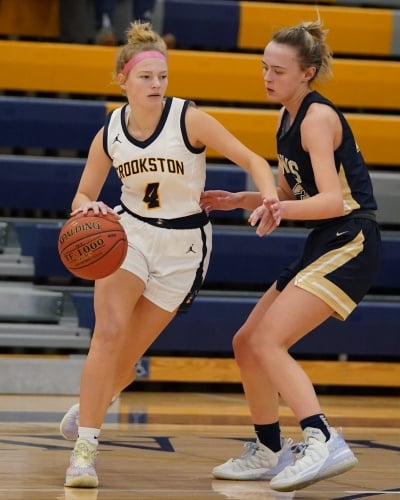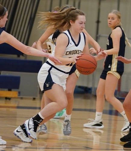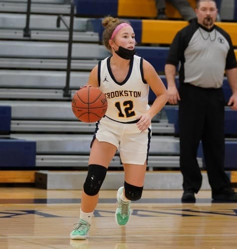 Crookston’s Hayden Winjum won the opening tip and got the ball back and drove into the lane for a layup to give the Pirates a quick 2-0 lead. Hermantown responded with a three-pointer before Crookston went on a 12-0 run behind suffocating defense and outstanding offense. “We talked about it before the game that we come out and set the tempo defensively and we were much better than we were yesterday,” said Pirate Coach Darin Zimmerman. “We played full-court defense and i was pleased with the way we set the tone on the defensive end.” The run was started by Abby Borowicz’s three-pointer, Emma Osborn had a basket, Ally Perreault rattled home a three-pointer for a 10-3 lead. Halle Winjum had an offensive rebound and a basket, and then Halle followed with a three-point play for a 15-3 lead with 12:36 left in the half. “We had great offensive execution and when we missed a shot we crashed the board,” said Coach Zimmerman. “We did a nice job of making the extra pass too.” Hermantown broke the run with a basket with 12 minutes left. The teams exchanged baskets for a few minutes and with Crookston leading 20-11, Hayden Winjum converted a three-point play, Halle Winjum had a steal for a layup, and Hayden added two free throws for a 27-11 lead. “That gave us a little bit of a cushion,” said Coach Zimmerman. “It was important to play as well as we did.” Crookston led 34-16 with three minutes left and didn’t score the rest of the half as Hermantown finished on a 7-0 run to get within a 34-23 deficit going into halftime.