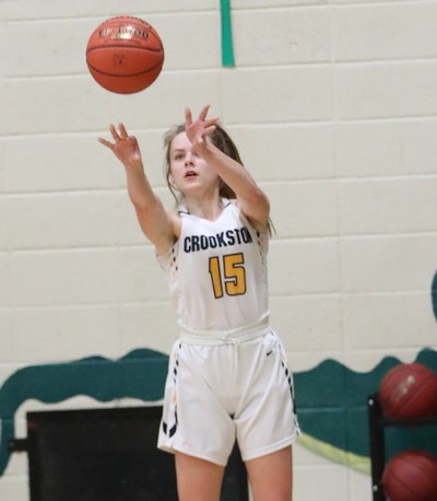 Crookston jumped out to a 4-0 lead after an Emma Borowicz steal that led to a Hayden Winjum basket, which was followed two Kasey Cwikla free throws. “We wanted to come out playing aggressive and playing our style,” said Coach Zimmerman. BGMR answered with a free throw and a three-pointer to tie the game at 4-4. The teams were tied again at 6-6 just over three minutes into the game. BGMR took their first lead with two free throws from Anissah Novacek for an 8-6 lead. Crookston answered with a Dani Boyle three-pointer before the Gators followed with a basket for a 10-9 lead with 13:07 left in the half. It was this point in the game, the Pirates started to wear down BGMR with their defense, and they went on a 10-2 run led by four points from Emma Borowicz, and Crookston led 19-12. “That got us going and playing our way,” said Coach Zimmerman. “Once we got the run going we settled in a little more.” The teams played even for about five minutes until Crookston’s Emma Borowicz took over the game. Emma had a steal that led to a layup, and after a BGMR basket, she followed with back-to-back three-pointers in the final 95 seconds of the half to give the Pirates a 33-21 lead going into halftime. Crookston was 9 of 10 from the free-throw line. “I thought we shot the ball well and it was nice to see the girls were aggressive and making their free throws,” said Coach Zimmerman. “Emma took over and was playing great at the end of the half.”