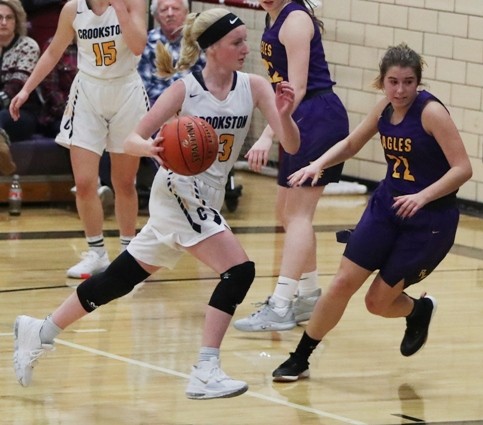 The Crookston Pirate Girls Basketball team won a hard-fought battle and held off a late rally by the Red Lake Falls Eagles in a 70-59 victory in a game played at Robert Matzke Gymnasium in Red Lake Falls.