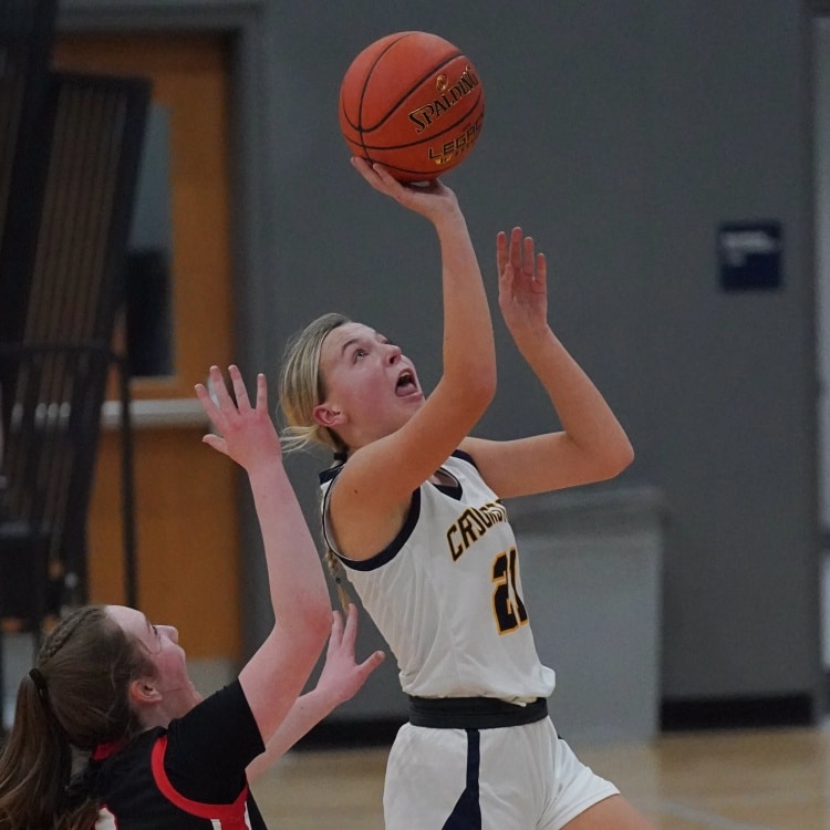 It was a slow start to the game before Red Lake County Central scored the first basket almost two minutes into the game. Crookston responded with a Madi Bruggeman basket and a Chloe Boll three-pointer for a 5-2 lead. After a Mustang three-pointer from eighth-grader Aubrey Halverson, Crookston’s Naomi Johnson answered with a nice up-and-under move for a basket and a 7-5 lead four minutes into the game.