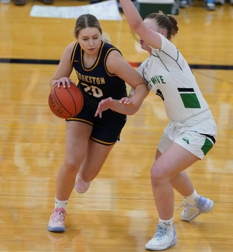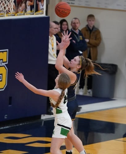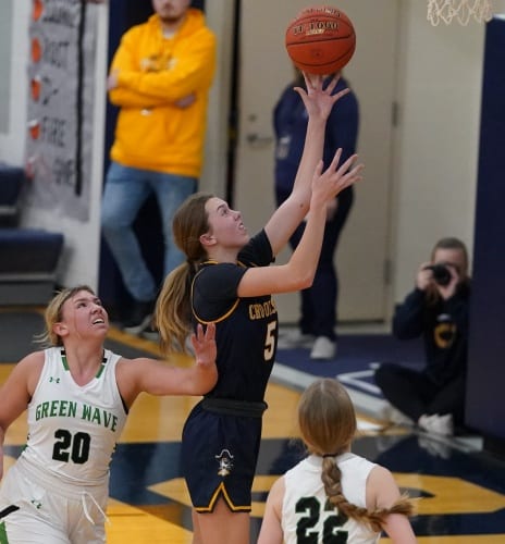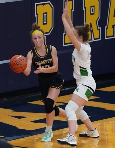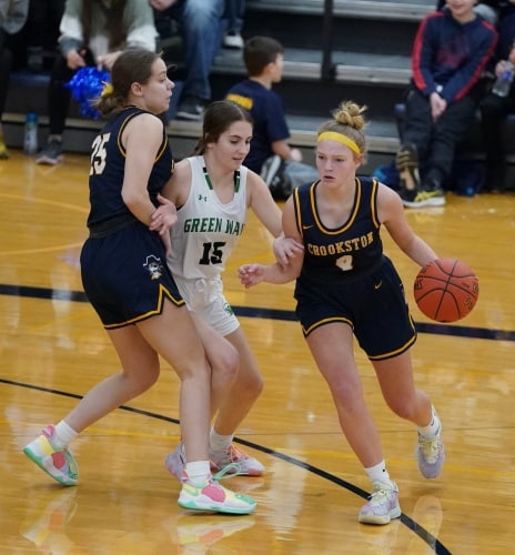 The start of the game was a sign of things to come the rest of the game. Crookston was patient on their first offensive possession of the game, and they worked the ball around before finding Abby Borowicz for a three-pointer. Crookston’s Halle WInjum scored on a short jump shot in the lane on the next possession, and Crookston led 5-0 two minutes into the game. Over30-seconds later, Crookston’s Emma Osborn buried a three-pointer for an 8-0 lead. “The energy in the game was really good,” said Osborn. “The student section was in it, the fans were in it, and the players were in it. We were all back in our groove.” East Grand Forks finally got on the board with a three-pointer from Tatem Votava (an eighth-grader) a little over three minutes into the game. Crookston responded with another three-pointer from Osborn and after four points from the Green Wave freshman post Addison Kujawa. “We didn’t like our defense in that stretch,” said Coach Zimmerman. “Ther girls weren’t happy with the defense either.” Crookston called a time out and responded with a 14-0 run with five points from Osborn and back-to-back three-pointers from Hayden Winjum, Borowicz, and Halle Winjum for a 25-7 lead. “The difference between our two losses last week and the game tonight was our offense,” said Coach Zimmerman. “Our offense was great, we were taking shots within rythm and I was pleased with our offensive execution.” East Grand Forks’ Brynn Havis scored before Crookston’s Osborn followed with back-to-back three-pointers for a 31-9 lead with six minutes remaining in the half. Crookston led 32-12 with two minutes left in the half when Hayden Winjum made a three-pointer and was followed by another Borowicz three for a 38-14 lead after the 11th Pirate three-pointer of the half. East Grand Forks missed a shot, and Crookston’s Borowicz grabbed the rebound along the near sideline, in front of her bench and dribbled the ball to half court, and fired a shot that just missed off the front of the rim, and the Pirates took a 38-14 lead into halftime. “That was nice for Abby to make a great heads-up play,” said Coach Zimmerman. “She secured the defensive rebound and got the ball up the floor quick. It didn’t go in, but she made a great play. I was happy with the first half and the way we played for most of it.”