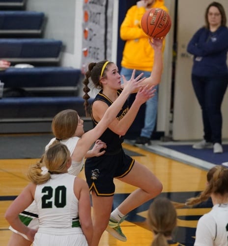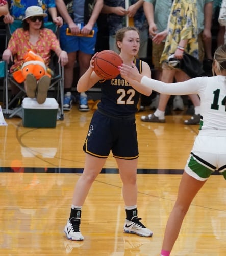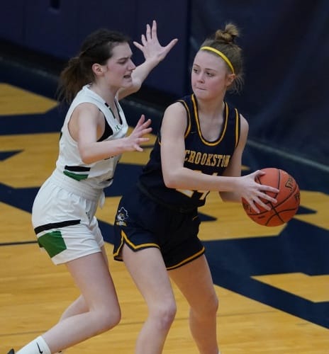 “The message at halftime was we are tied 0-0 to start the half,” said Coach Zimmerman. Crookston came out strong in the second half at Hayden Winjum, Emma Osborn, and Halle Winjum made the 12th, 13th, and 14th three of the game for a 47-20 lead less than four minutes into the half. On the Halle Winjum three-pointer, Emma Osborn made a great one-handed catch on the baseline and was able to spin and kick a pass out to Winjum for the three-pointer. “Emma made a great catch and didn’t panic and was able to make an excellent pass the Halle,” said Coach Zimmerman. Crookston led 49-22 when Osborn converted a three-point play and followed it up with her seventh three and the 15th of the game for the Pirates to take a 55-22 lead with eight minutes left in the game. Crookston went to the bench the rest of the game and was able to play five of the senior reserves together for the final minutes, as it was the last home game of their Pirate basketball careers, and Crookston won the game 59-41. “We got everybody good quality minutes tonight and to get all the seniors on the floor in the last home game, so that was nice,” said Coach Zimmerman. “It was a good game with a great atmosphere. We had to delay the start of the game because there was a line waiting to get in, but that is a good thing.” Crookston ended the game with 15 three-pointers, which accounted for 45 of their 59 points and Osborn, the Crookston Girls Basketball season three-pointer leader, added seven three-pointers in the game. “I didn’t shoot very well in the last two games, so I went to open gym on Sunday and worked on my shot,” said Osborn. “Tonight was pretty fun and once one of us makes some shots we all follow.”