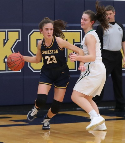 The Crookston Pirate Girls Basketball team jumped out to a 13-3 lead to start the game and held off a feisty East Grand Forks Green Wave comeback to win a defensive battle 32-28 in a Section 8AA first-round playoff game played in front of a big crowd at the Crookston High School gymnasium.