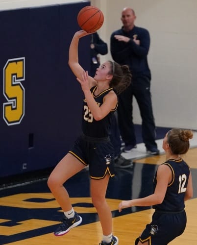 Crookston’s Emma Osborn had a steal and a layup to set the tone for the game and a 2-0 lead.  Ally Perreault followed with a basket in the paint to force a Red Lake Falls timeout one minute into the game.  After the timeout, Abby Borowicz scored on a no-look wrap-around pass from Halle Winjum.  Halle would follow up the beautiful pass with a three-pointer of her own and then a layup for an 11-0 lead.  Osborn followed with a three-pointer, Halle Winjum had a steal that led to a three-point play and a 17-0 lead to force Red Lake Falls into another time out with 14:38 left in the half.  After the time out, Hayden Winjum followed with a basket, Perreault added two more points.  Osborn, Hayden Winjum, and Jenna Coauette added back-to-back three-pointers including a bank shot from Coauette.  The run wrapped up with a Perreault basket and a 32-0 lead.  “That was a great way to start the game with good shooting, good defense, good ball movement,” said Coach Zimmerman. “It was great team basketball with multiple kids doing different things and it was our best transition we have played so far this year.”