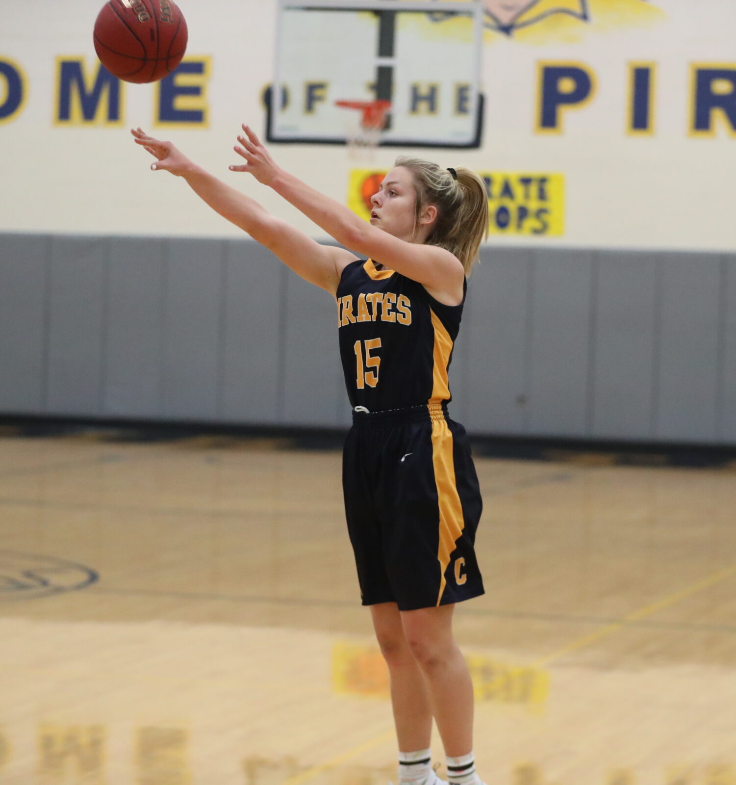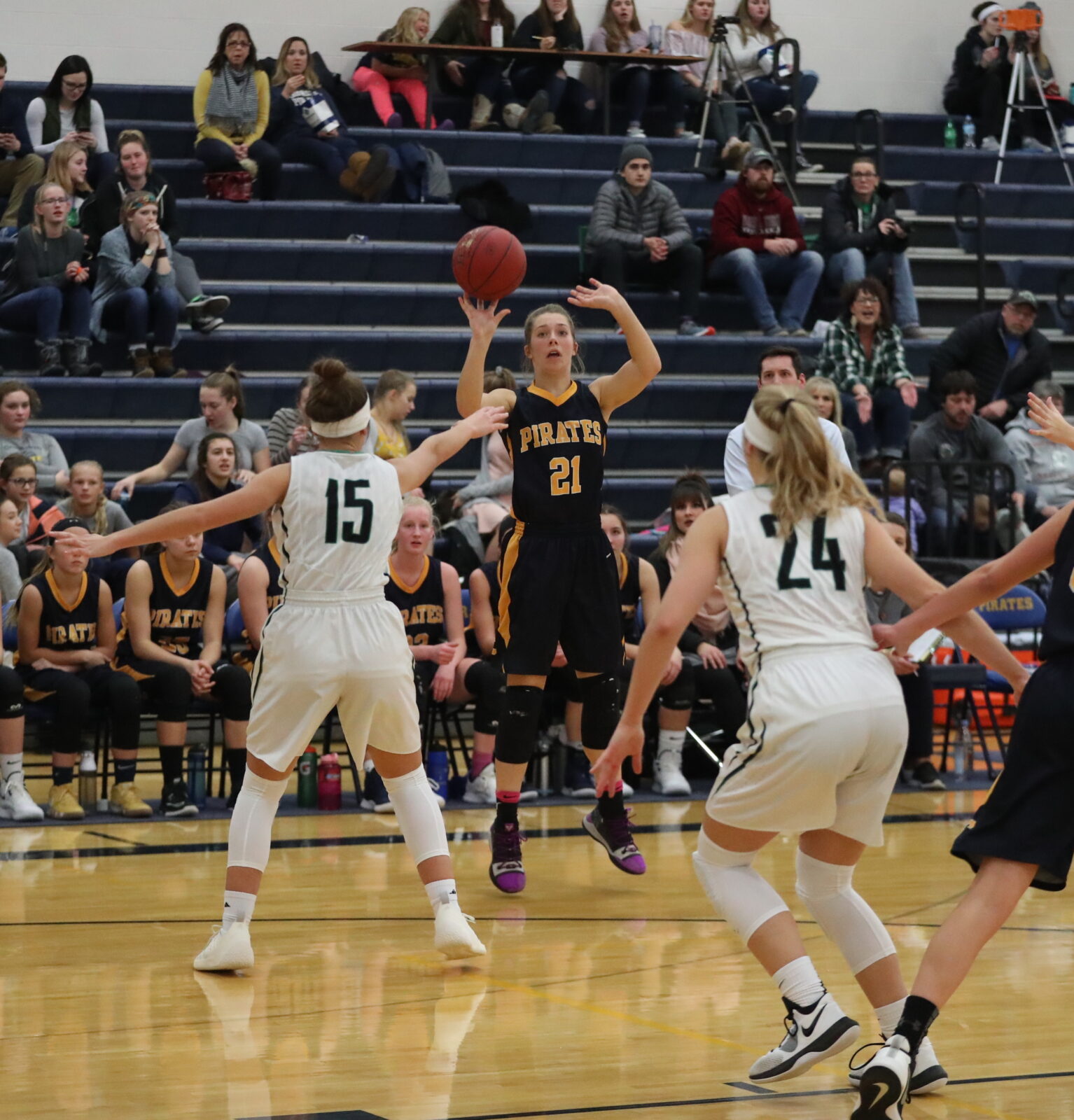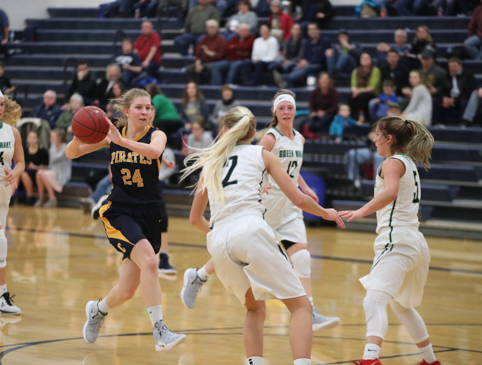 Emma Borowicz scored the first three points of the game for Crookston, but the Green Wave managed to jump out to a 10-3 lead after a Chloe Torgerson scoop shot in the lane. Trailing 17-8, Emma Borowicz kicked a pass out to Danielle Boyle along the right-wing allowing Boyle to spot up and make the three-pointer cutting Crookston’s deficit down to 17-11. East Grand Forks used a 4-0 run to take a 21-12 lead before Gretchen Theis knocked down a jump shot from the right side of the floor to pull within 21-15. Trailing 23-15, Kasey Cwikla pulled down an offensive rebound for the Pirates and was fouled while releasing her put-back shot, making the floater despite the contact cutting the visitors’ lead down to 23-17. Emma Boll dribbled down the left side of the paint in the closing minutes of the first half and made a lay-up as she was falling down to pull the Pirates within 28-19, but an East Grand Forks’ free throw from Breanna Olson gave the Green Wave a 29-19 halftime lead. “We’ve got to give them some credit because they played really well,” said Crookston head coach Darin Zimmerman of his opponent’s performance in the first half. “We just kind of forced things too much. We hadn’t really reversed the ball very much and as soon as we did that, out of a timeout, we hit two reversals, found Emma Boll and she made a tough shot and we just didn’t do that consistently enough. Get those ball reversals, get good spacing and attack that zone a little more. Our defense was really good and if we keep playing defense like that we’re still going to win a lot of games, but offensively we have to take care of the ball a little bit better because we gave them a few opportunities and took a few extra shots away from ourselves by turning the ball over.”