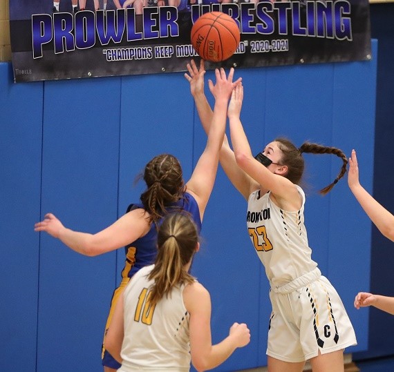 Crookston started the game by going on an 11-3 run with Abby Borowicz scoring the first basket of the game. Halle Winjum made a free throw and Hayden Winjum added a basket for a 5-0 lead. After Thief River Falls’ Abigail Flaagen scored the first Prowler points with a three-pointer, but Crookston responded with a Hayden Winjum basket, and back-to-back offensive rebounds for baskets by Emma Borowicz and Emma Boll for an 11-3 lead less than six minutes into the game. “Rebounding is an area of emphasis for us,” said Coach Zimmerman. “I thought we did a great job of getting the rebounds and I was impressed with our tenasity.”