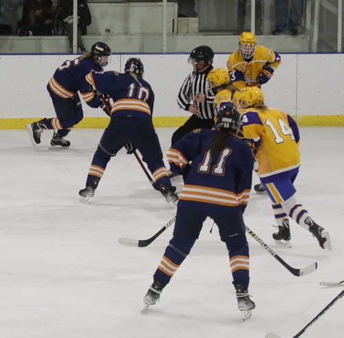 Not to be outdone by a transplant forward, Nelson would score four and a half minutes into the second period on a rebound of an Ashlyn Bailey shot to make it 3-0.” Morgan has really been playing well,” said coach Meyer, “she has great anticipation, skates well and knows the game.” It was the fourth goal of the year for the sophomore. Crookston would get into some penalty problems and skated short-handed five on three for 21 seconds. Thief River Falls didn’t score on the 5 on 3, but they did score on their 5 on 4. Carli Prickett, also a converted forward from the defensive side, scored from a quick rebound goal on a shot from Quinn Kenfield and it was 3-1 about halfway through the second period. “Even though it was only a few seconds on their two-man power play, it gave them some rhythm on the power play, and unfortunately they were able to score, “said Meyer. “We felt good with the 3-1 lead after two periods, but also knew they weren’t going to go away, so we had to keep playing our game.”