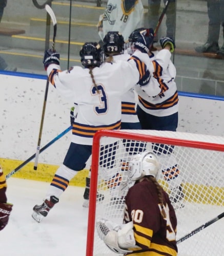 It didn’t take long in overtime as just over a minute into it, Fergus Falls put on a rush, having all three of their forwards working the puck along the boards, and Madlyn Hulter was in the circle to the right of Magsam, and she quickly fired a crisp pass to the left of Magsam where waiting was the eighth-grader Johnson and a beautiful one-timer that Magsam had no chance on to give Fergus Falls the 4-3 win in overtime. “There wasn’t much you could do on that play, it was a nice pass and a quick shot, and it was a nice clean goal by them,” said Meyer.