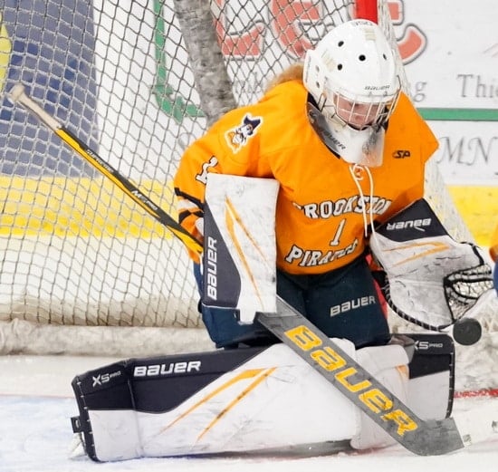Crookston had to make some changes with defenseman Ashlyn Bailey out with a back injury suffered last night in the Prior Lakes game. Morgan Nelson was moved back to defense, where she played last year, and the top two lines were changed a bit. The Pirates started the game with some hop and had some excellent grade-A quality chances but were turned aside by Freshman goalie McKenna Carr to keep the Pirates off the scoreboard. With just under six minutes left in the period, Crookston sophomore defenseman Emma LaPlante played defense as compared to a forward last year, where she scored 13 goals, grabbed a Thief River Falls clearing pass, and walked in on the Prowler defense, made a move that put her all alone with the goalie and snapped off a shot that beat Carr to her glove side for the first goal of the season for Crookston and a 1-0 lead. Thief River Falls put on a little rush later in the period, but Freije was on her game tonight after giving up five goals last night and stopped everything her way, deflecting shots to the corner, using her glove, and Crookston was up 1-0 after a period. “Our girls learned a lot playing last night against Prior Lake,” said Crookston head coach Emily Meyer, “We told the team that we had to make sure they took control of the game, and I thought we did that right away. We were aggressive on the forecheck and controlling in their zone, which was a good spark. Emma’s goal was a huge momentum swing for us as we were still gripping our sticks a little tight, wondering if we would ever score.”