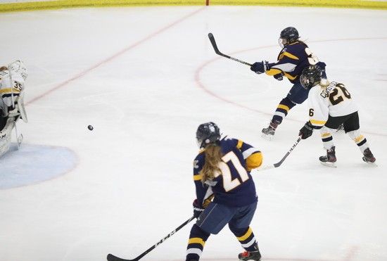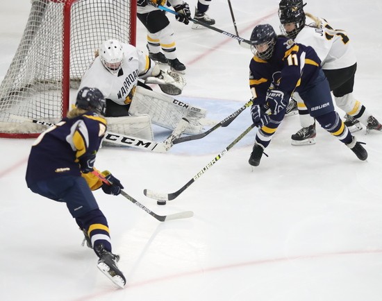 Trying to win the second period was not in the cards for the Pirates as Warroad scored three times in the first six minutes of the period, Adriana Huerd on her first shift of the game. Then the Hendrickson sisters, Talya on a nearly three on nobody but the Pirate goalie and Genevieve got her third of the game and Warroad led 8-0. “We were losing people all night,” said coach Moe, “we didn’t know where we or they were on the ice a lot, and that contributed to a number of goals.”  Genevieve Hendrickson would score two more in the period, the second one on a beautiful tip in front that found the net, and Abbey Hardwick also scored and led 11-0 after two periods. “Kailee Magsam had 27 saves after two periods,” said Moe, “she gave up some goals, many were not her fault, and she really made some tough saves too. You could look at the scoreboard and say the goalie wasn’t playing well. That wasn’t the case here.”