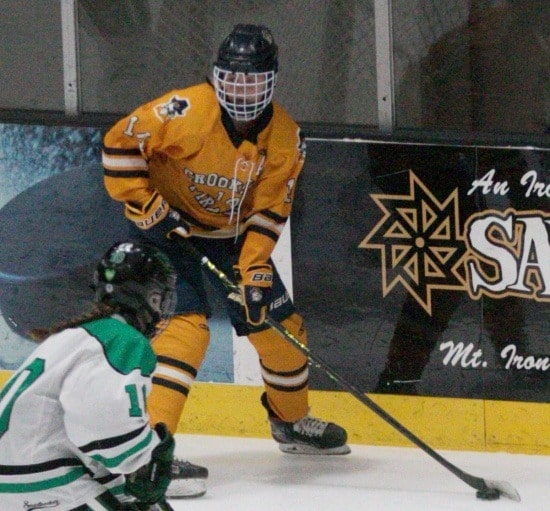 Rock Ridge called a time-out, pulled their goalie, and Crookston gained control of the puck. Pirate senior Morgan Nelson did not score a goal last year playing defense, and the Pirates were hoping and trying to help Morgan get one to the start of the season. Nelson had the puck just inside the Wolverine’s zone and slid a shot to the open net just wide to the right. “Ashlyn Bailey has been taping Morgan’s stick since last year before every game we’ve played,” said Swanso. “So we decided tonight that should change, and Addie Fee will start taping it from now on.”