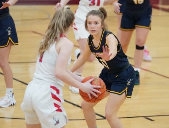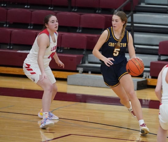 Crookston had a good start to the game with a long pass to Libby Salentine for a layup and a 2-0 lead. Detroit Lakes responded with a 7-2 run before the Pirate’s Emma Gunderson scored a basket and was followed by a Halle Winjum three-pointer to tie the game at 7-7 three minutes into the game. The teams were tied at 11-11 before Detroit Lakes built a 17-12 lead. Crookston’s Salentine had a rebound and putback to bring the Pirates within a 17-14 deficit halfway through the half, but it was all Detroit Lakes the rest of the way as they used their size and length on defense and phsicality and size on the offensive side to go on a 12-0 run for a 29-14 lead. Crookston finally stopped the run as Winjum made a three-pointer. After a Laker basket, Winjum added two free and Salentine ended the half with a rebound and basket and Detroit Lakes took a 31-21 lead into halftime.