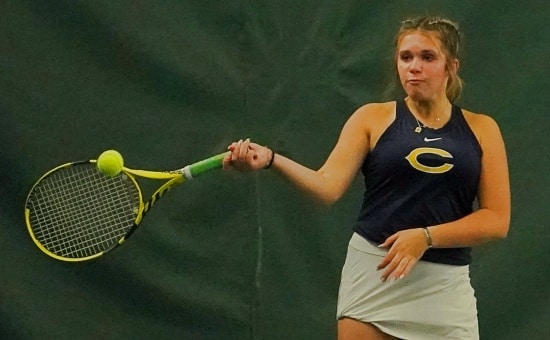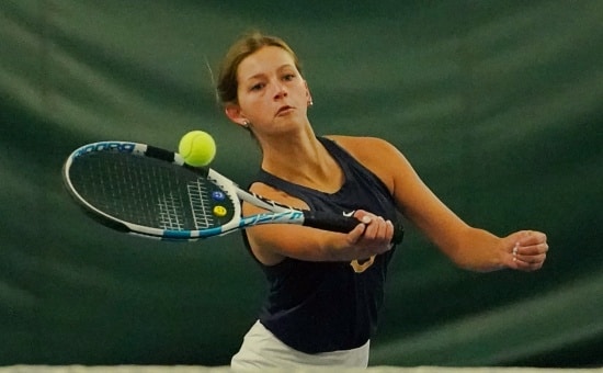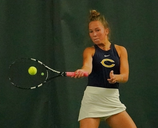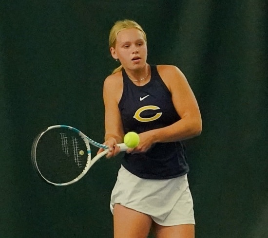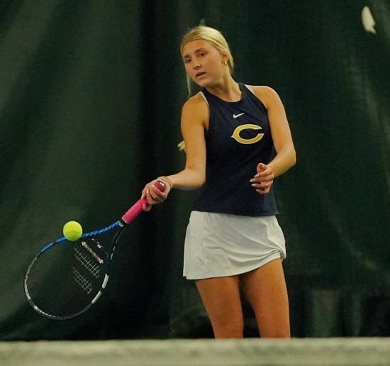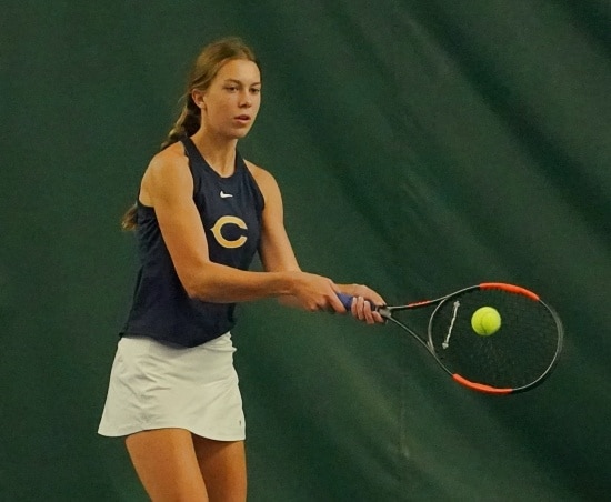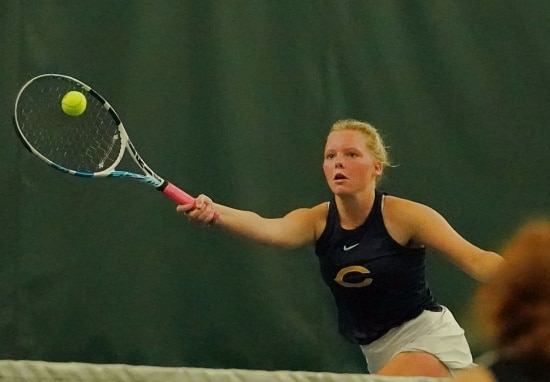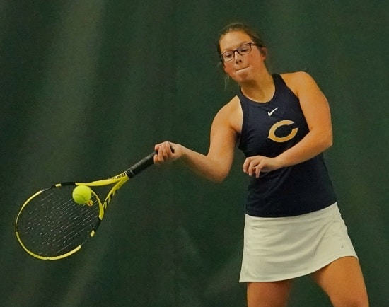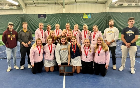 At about the same time, Staples-Motley won the fourth singles match 7-6 (7-4), 6-1 and within minutes, Crookston won the third doubles match with Kaylie Clauson and Addie Fee trailing early in the first set, but the duo settled in and won 6-4, 6-2 and the match was tied at 3-3 with the only match remaining was third singles. “They started a little slow, but they have found their niche playing together in the second half of the season,” said Coach Brekken. “They played a solid match and looked good out there today.”