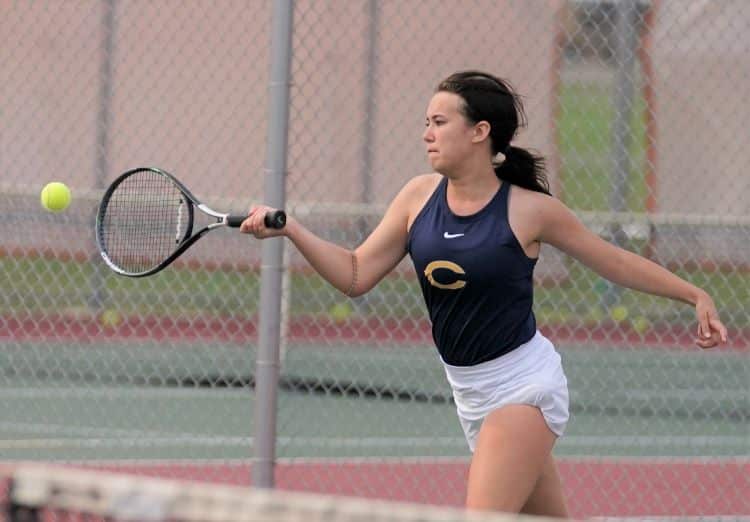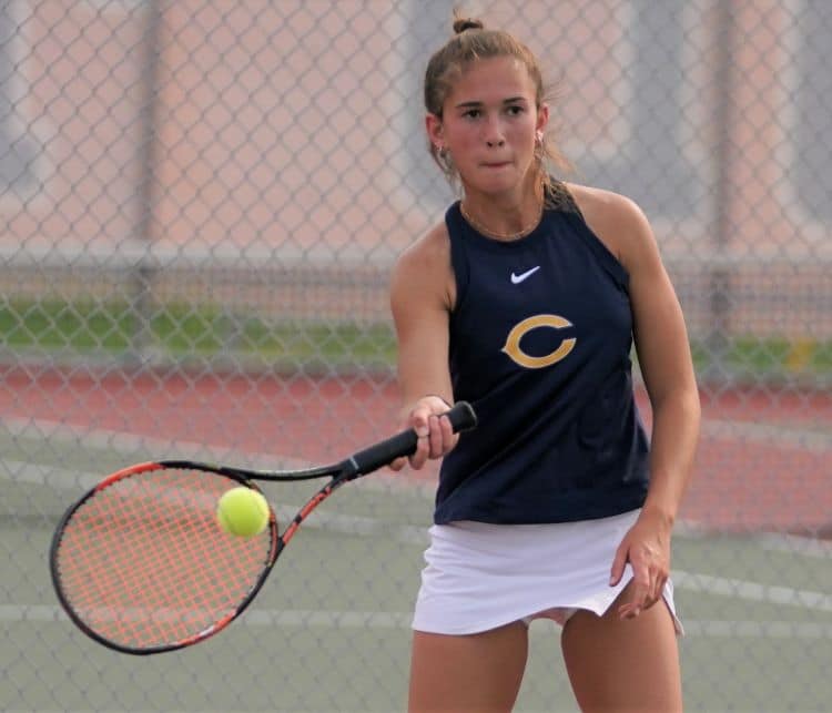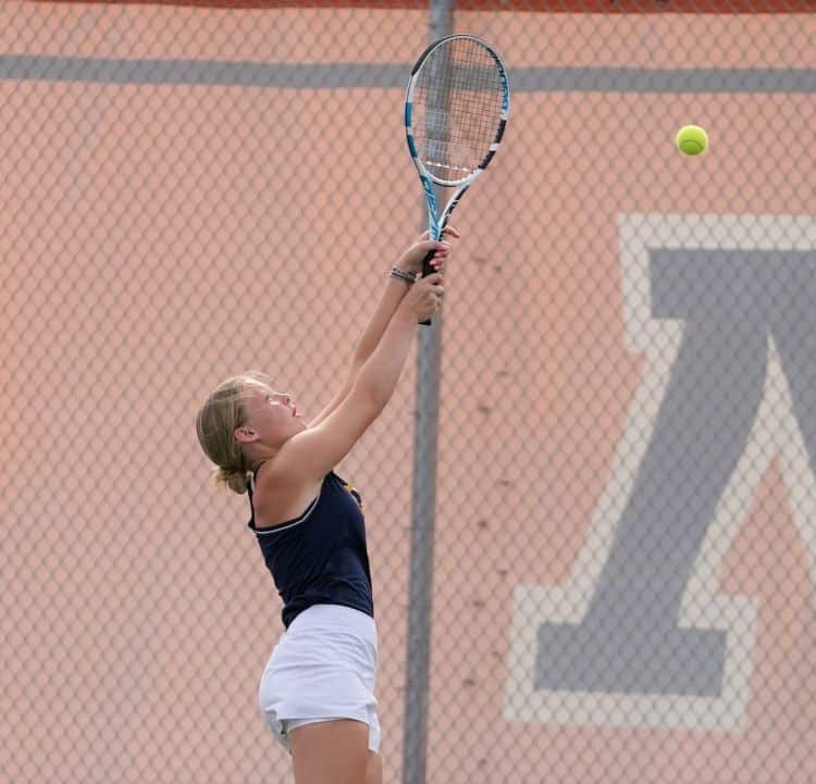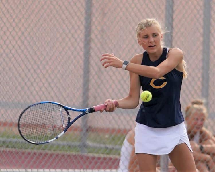 The first match complete was Emma Osborn at second singles and she cruised to a 6-1, 6-1 victory. “Emma played well,” said Coach Tiedemann. “She had a great day and the way she can drive the ball it works well when it is windy like it was today.”
