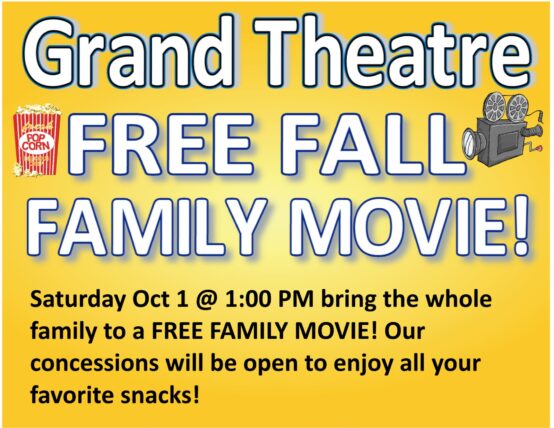 The Free Fall Family Movie event will be held in the Crookston Grand Theatre on Saturday, October 1, at 1:00 p.m. With other movies beginning at 4:00 and 7:00 p.m., with many new family movies and other movies coming in over the next couple of weeks. If you would like to plan a private event at the Grand Theatre, you can call them at 218-281-1820.