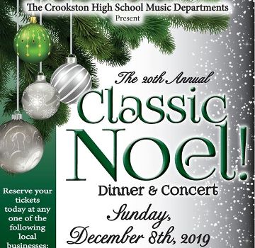 The Crookston High Choir & Orchestra will hold it’s 20th Annual Classic Noel Concert at 7:30 p.m. Tickets are still available for the concert only and will be sold at the door. The cost is $4 for adults and $3 for students. The dinner prepared and served by Drafts, for those with dinner tickets will begin at 6:00 p.m., with doors open at 5:30 p.m.