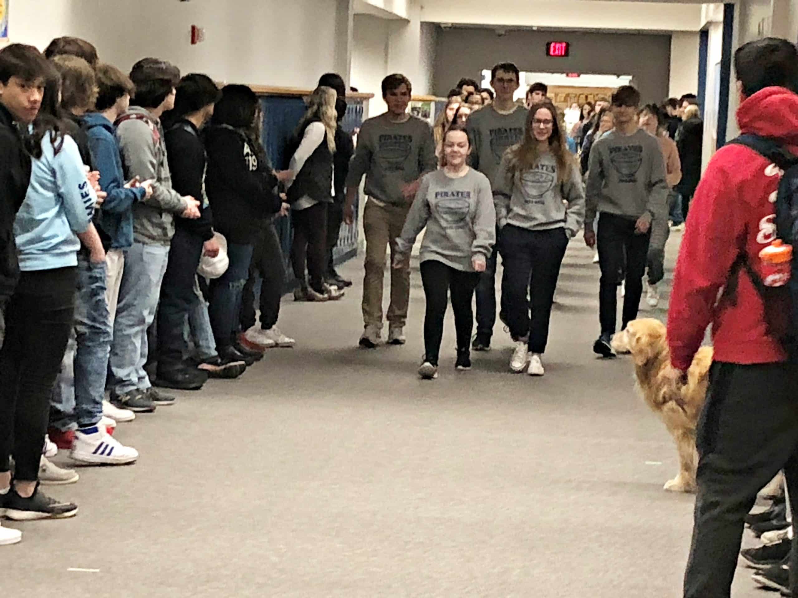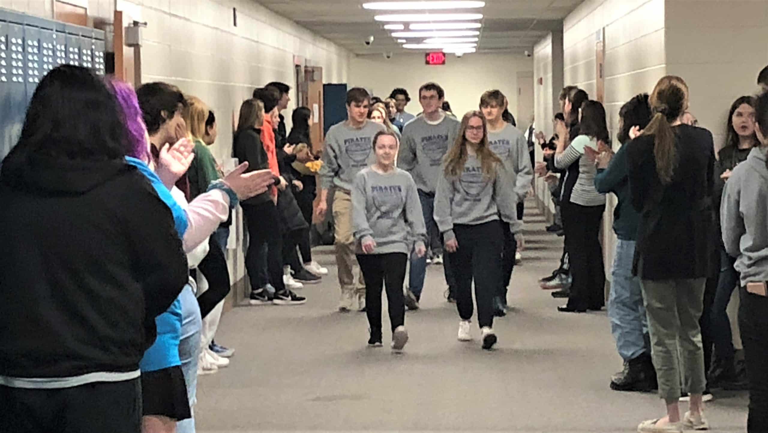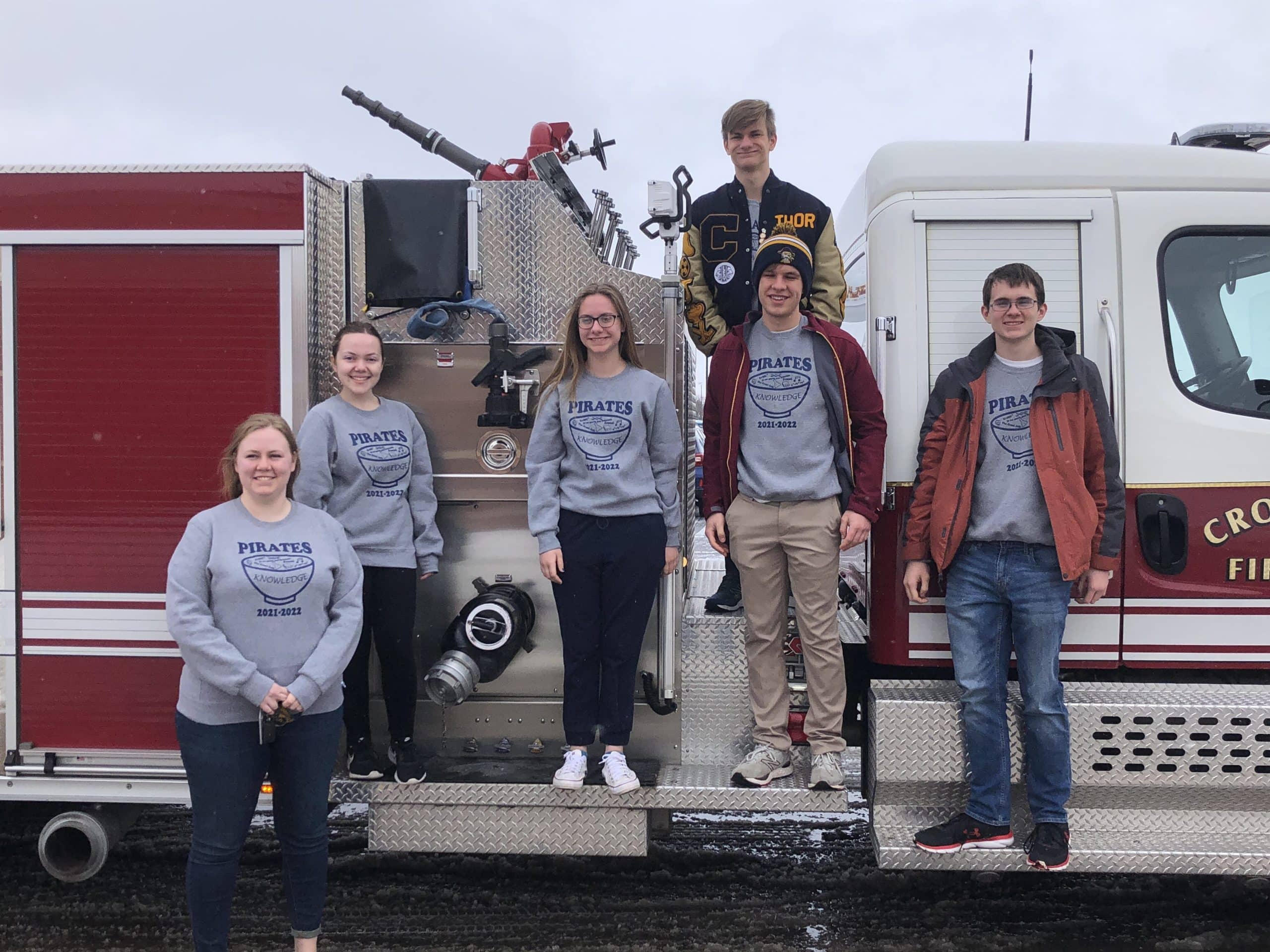 The Crookston High School Knowledge Bowl team received a spirited send-off this morning from the school before heading to the State Knowledge Bowl competition at Cragun’s Resort in Brainerd today and tomorrow. The five students were Ainsley Boucher, Maddie Harbott, Nathan Johanneck, Tatum Lubinski, Thor Harbott, and their coach Katelyn Stegman.