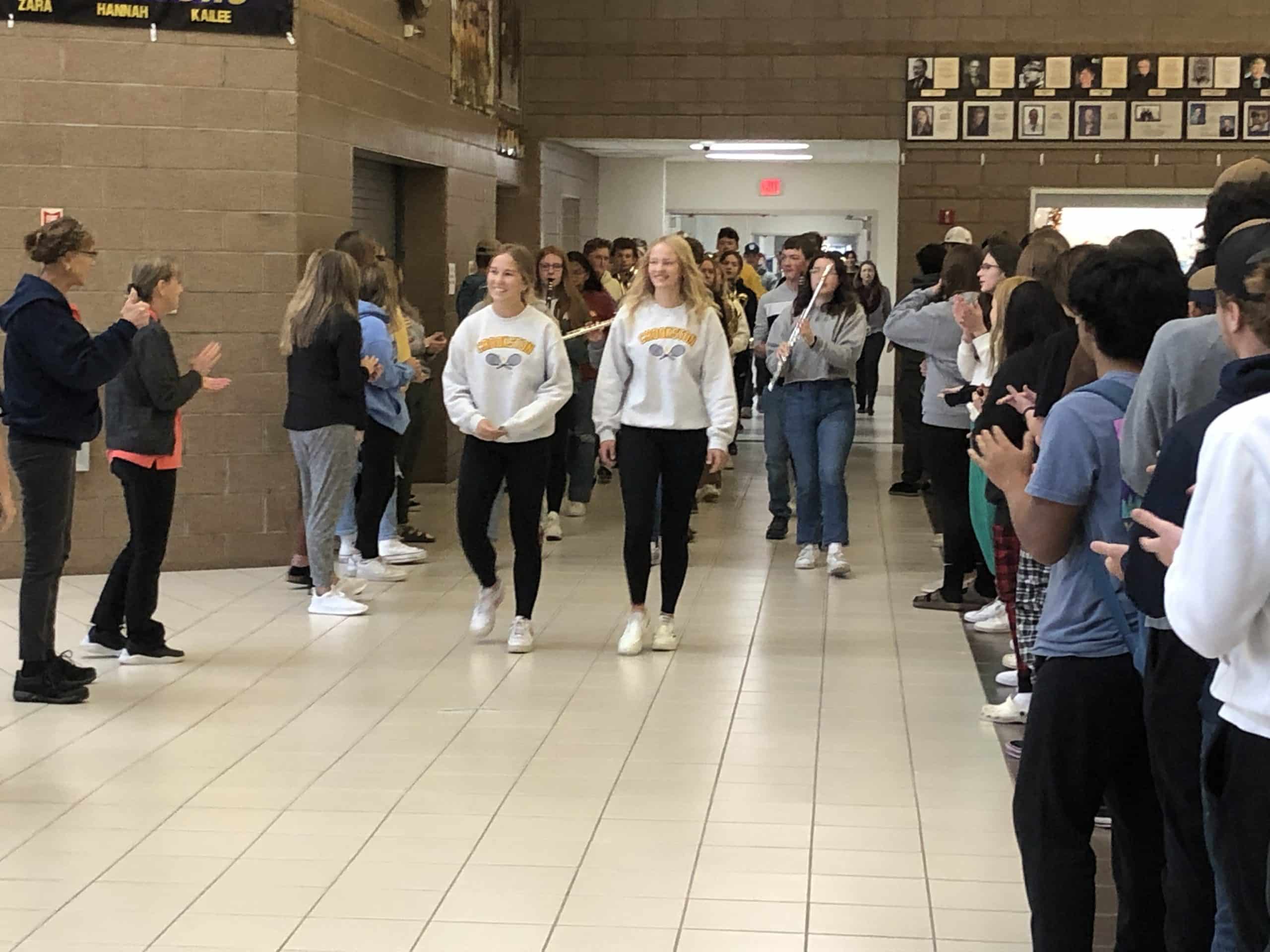 Pirates coach Cody Brekken voiced his excitement for the girls being qualified for the tournament. “In the individual tournament, these two played really well throughout the whole tournament, only dropping eleven games in their three matches,” Coach Brekken explained. “They became doubles champions for the Section Tournament Individually and onto the State Tournament.” Coach Brekken also voiced his excitement for the school for recognizing them for such an accomplishment. “These send-offs are always huge moral support for the teams, and it’s a huge accomplishment to make it to a State Tournament,” Brekken explained. “It’s awesome to see the school recognize that and go that extra step to recognize any athletes that can get there, and it’ll be a fun time.” Winjum and Gunderson were also excited to see their school and classmates show them support and giving them the send-off, and felt ready to play some teams they hadn’t played in their regular season. “It’s always a lot tougher competition at the state level versus sections,” said Halle Winjum. “I know we can go out there and prove that we belong at State Tournament, but we have to be ready for anything. We’re not comfortable with these teams since we’ve never seen them, so they’re tough, but I think we can take them down and show them what we’ve got too,” said Emma Gunderson.