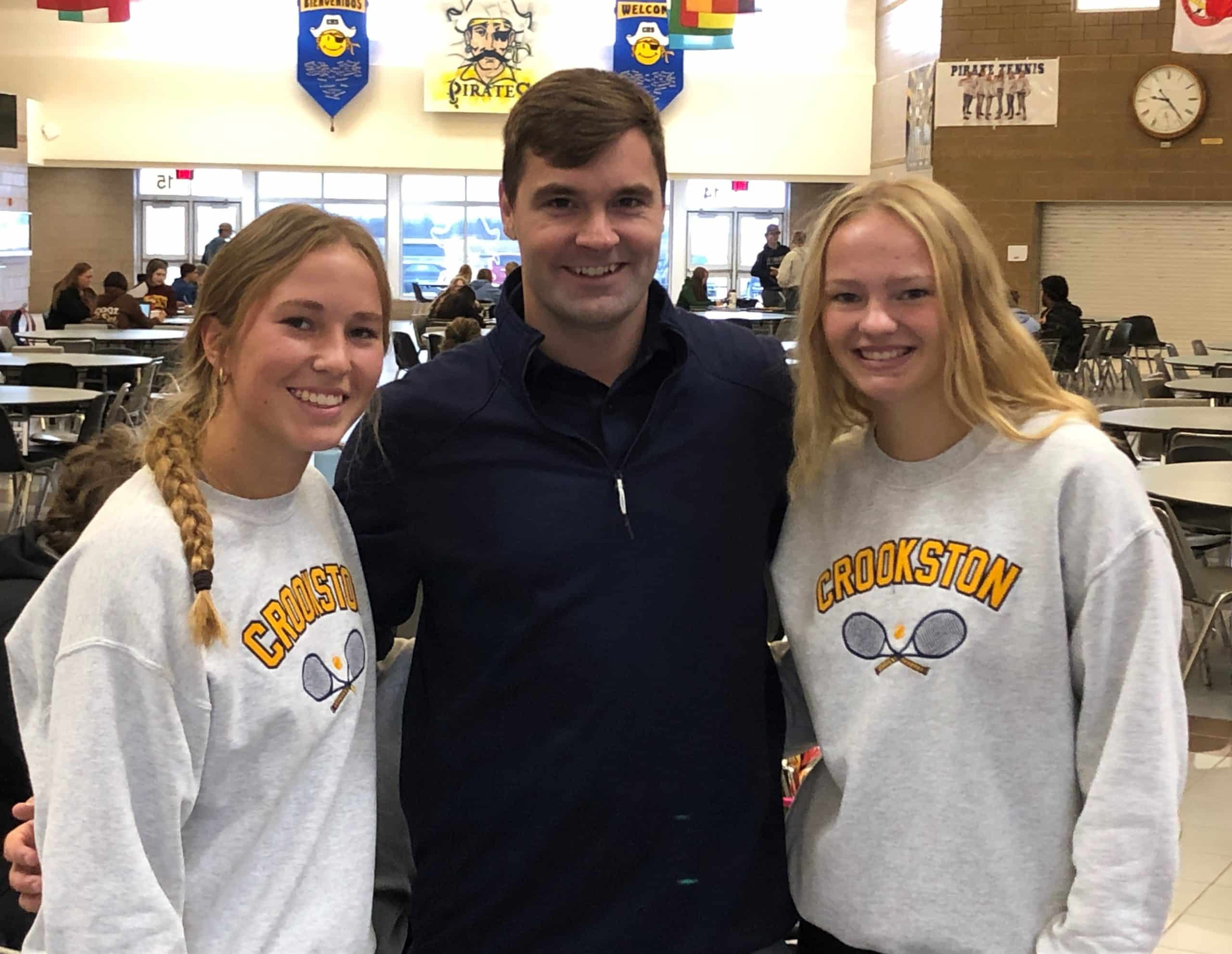The Crookston High School held the first of hopefully many send-offs for juniors Halle Winjum and Emma Gunderson of the Crookston Pirates Girls Tennis team this morning before the girls were ready to leave for the Section 8A Girls Tennis Individual Championship starting tomorrow at the Reed-Sweatt Tennis Center in Minneapolis. Students and teachers lined the halls to wish the girls good luck and well wishes. This is the second season in a row that the Pirates have sent individuals to the State Tournament, and both Winjum and Gunderson will be making a return appearance, this time as a doubles team.