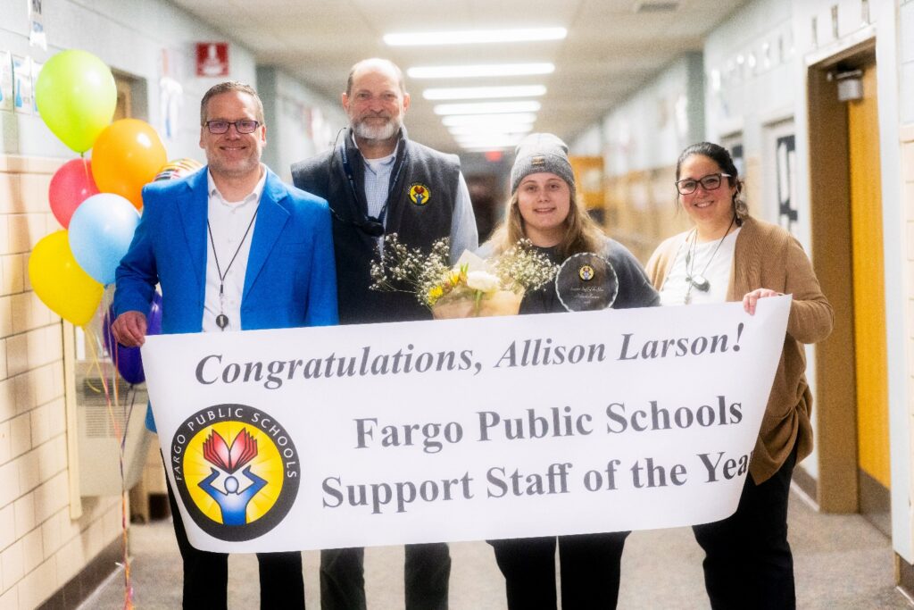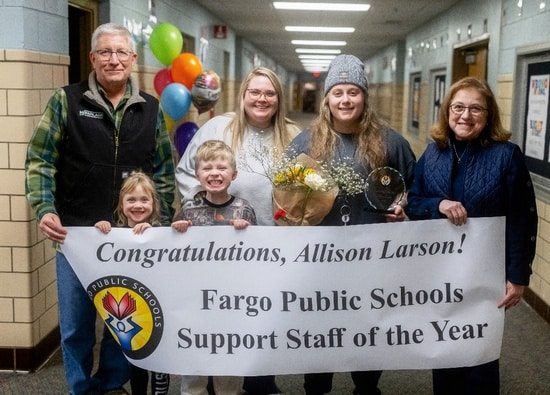 Crookston High School graduate Allison Larson, has been named the 2026 Fargo Public Schools Support Staff of the Year. Fargo Public Schools Superintendent Dr. Cory Steiner made the surprise announcement during a staff meeting. Larson is a Washington Elementary School Positive Behavior Technician and is the daughter of Craig and Melinda of Crookston.