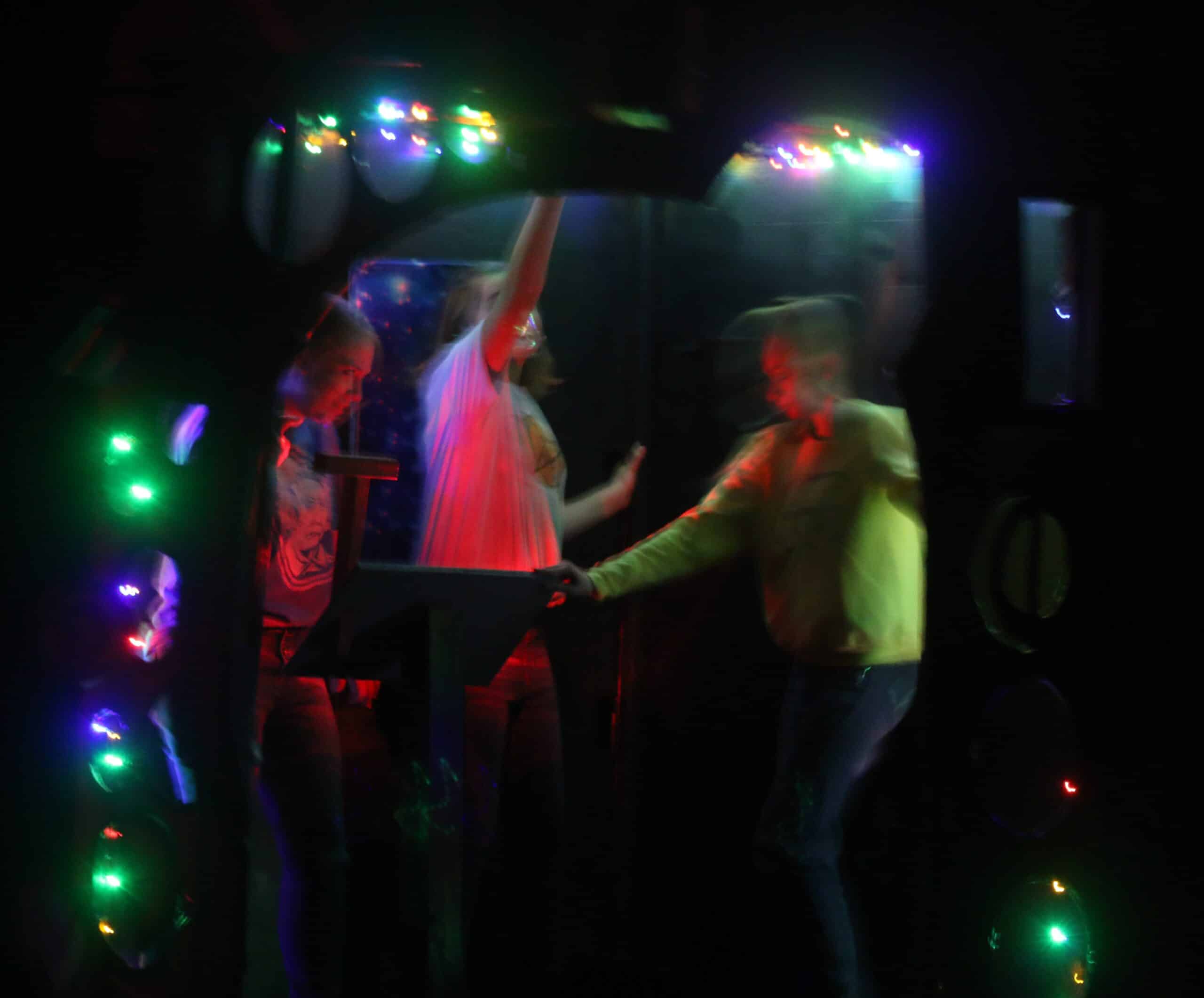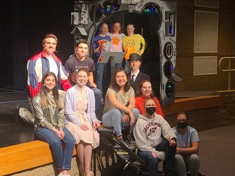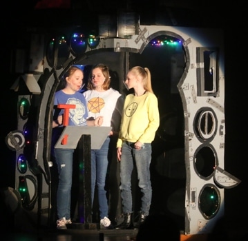 Besides managing the lighting for the show, Rezac created all the sound effects herself. “I was actually the one who made all the sounds on my computer, which Halle Bruggeman is running. We have Christmas lights for the time machine that we plug into the back, and I control from (the booth). The rest is some basic front-center, front-side, and side (lighting).”