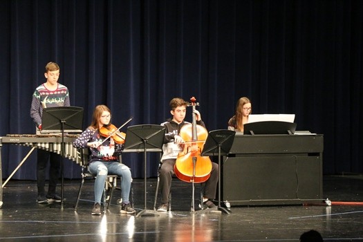 Isabelle Smith, Brooke Simpkins, Isaac Thomforde, and Caden Boike playing “Goodbyes” by Post Malone on instruments