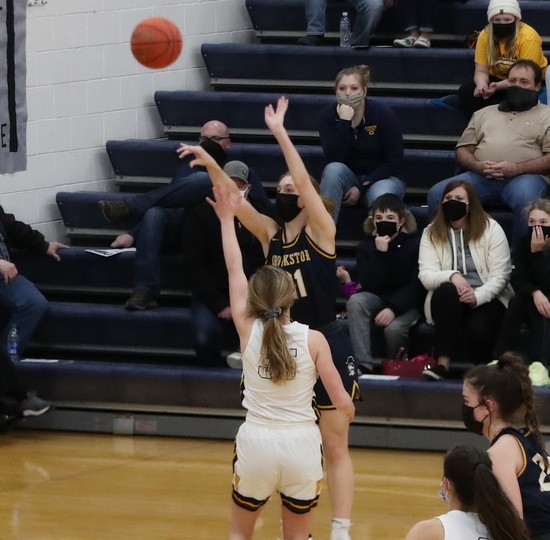 Crookston started the game focused and seemed to step up their play when they led 4-0 in the first minute.  The Pirates picked up the defensive pressure and starting hitting shots from all over the floor.  Emma Boll had an offensive rebound and putback, followed by another basket in the paint for an 8-0 lead.  Warroad scored their first point of the game on a free throw from Avianna Heppner with 15:56 left in the half.   Crookston scored the next 33 points of the game.  Emma Borowicz had 18 points, including four three-pointers, and Hayden Winjum had 10-points to lead the Pirates in the half.  At one point, Crookston made seven of their first eight three-pointers on their way to a 51-1 lead with 4:34 left in the half.  “That was a great start obviously.  The execution was good, the effort was good, teamwork was good and we checked all the boxes,” said Pirate Coach Darrin Zimmerman. “The girls were focused and it is a credit to how hard the girls have worked every game and it was fun to see them execute like that.”  Crookston went to the bench and subbed all five starters out and Warroad took advantage as they outscored the Pirates 8-0 in the final four minutes of the half.  The Warriors had two three-pointers from Catherine Thompson and a Heppner basket to get within a 51-9 deficit at halftime.   “The first half was one of the best halves we played this season in terms of execution, scoring, and defensively we were solid,” said Coach Zimmerman. “It wasn’t that we played bad in the last four minutes of the half,  you have to give Warroad credit because they kind of settled in and ran their offense and they have some athletes and did some nice things.”