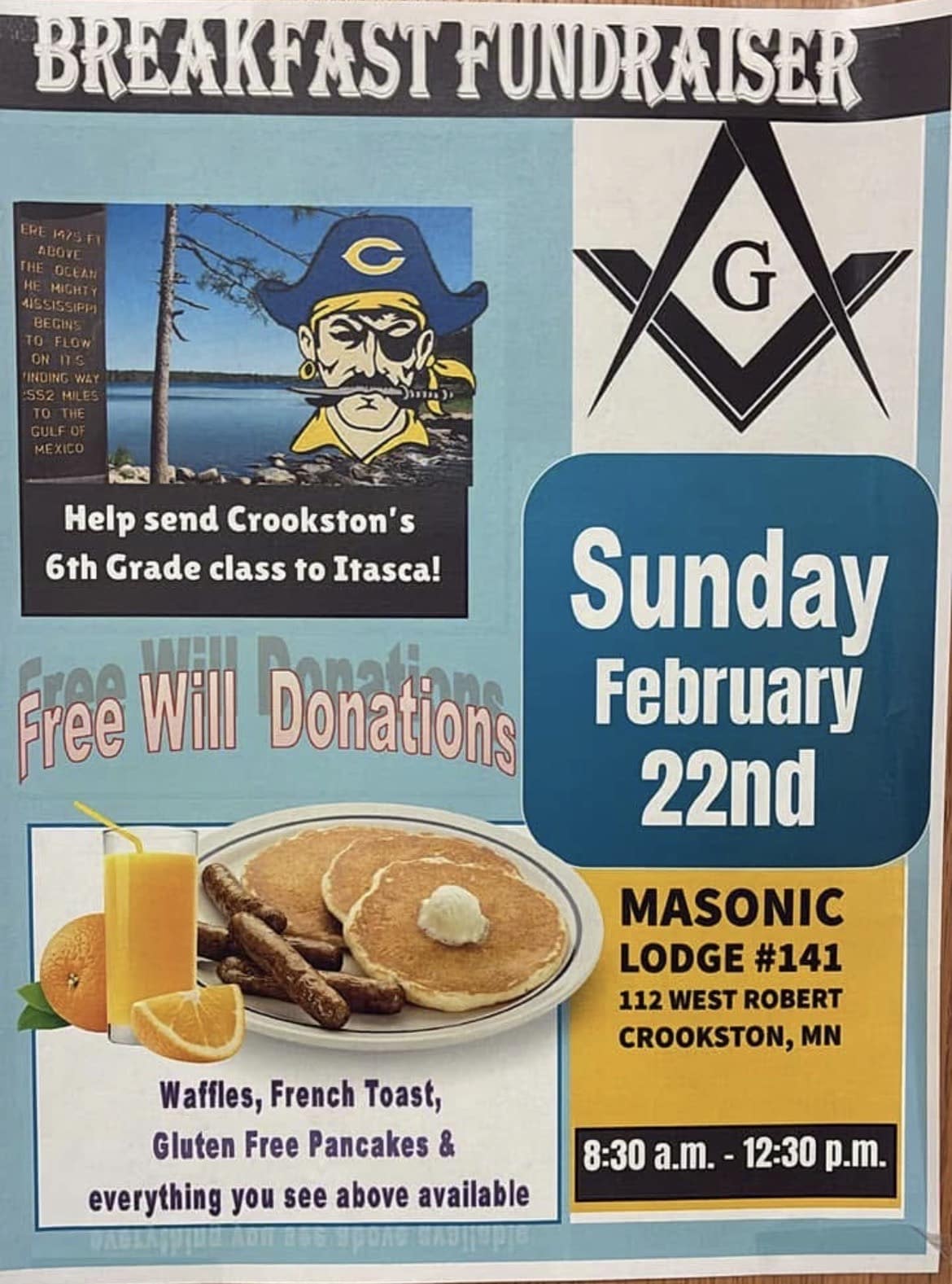 The Crookston Masonic Lodge will host a breakfast fundraiser on Sunday, February 22, from 8:30 a.m. to 12:30 p.m., at the Masonic Lodge #141, at 112 West Robert Street in downtown Crookston, with proceeds going to the Crookston Sixth Grade Itasca State Park Trip. The free-will donation breakfast will include waffles, French toast, gluten-free pancakes, sausage, and orange juice.