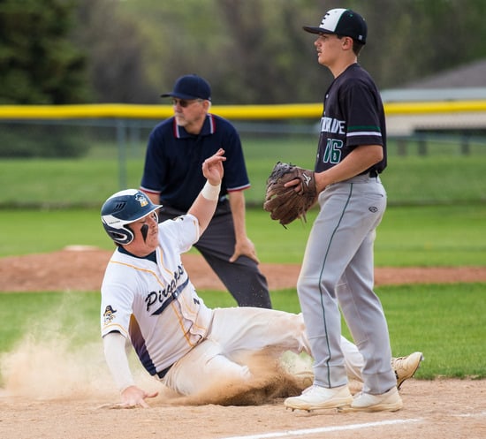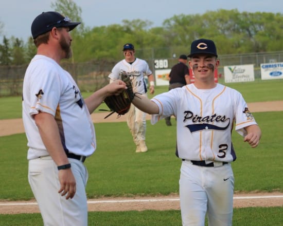 Crookston got off to a good start with a couple of runs in the first inning to grab an early lead. Gunner Gunderson singled to lead off the inning, and after an out, Brooks Butt doubled to bring in Gunderson. Cade DeLeon singled with two outs, and an error on the play scored Butt, and the Pirates had a 2-0 lead. “You could tell from the body language before the game that they were ready to go. Everything before the game was crisp,” said Pirates Head Coach Mitch Bakken. “It was Senior Night and playing East Grand Forks, so we were hoping it would be that way.”