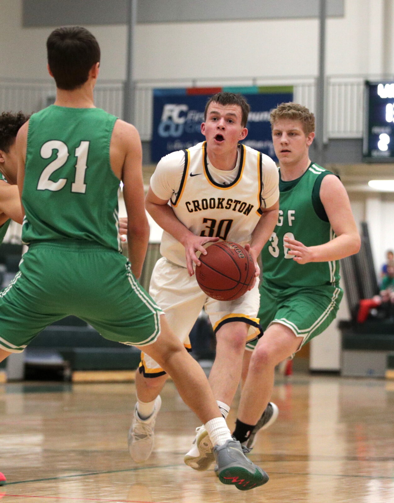 One minute into the first half, Tyler Aamodt swished a corner three-pointer giving East Grand Forks a 3-0 lead. Walker Winjum scored Crookston’s first points sinking two free-throws bringing the Pirates within 3-2. After a basket from EGF’s Sam Votava, Caden Osbon connected on two more free-throws trimming Crookston’s deficit down to 5-4. Following another Green Wave, basket, Nick Garmen buried a deep three-pointer tying the game at 7-7. Nick Garmen made another triple to give Crookston their first lead at 10-9 with 12:25 to play in the first half. Trailing 15-14, Caden Osborn scored inside followed by another Nick Garmen deep shot pushing the Pirates in front 19-16 with 9:03 to play in the first half. Walker Winjum scored pushing Crookston’s lead to 21-16. “Early on we were doing what we wanted to do,” said Pirate Coach Greg Garmen. “I thought the first nine minutes were very good.” East Grand Forks’ Tanner Campos scored to halt the visitor’s 7-0 run and bring the Green Wave back within 21-18. Campos basket proved to be a spark for EGF as Crookston turned the ball over on nine of their next ten possessions allowing East Grand Forks to carry a 19-0 run to a 35-21 lead over 5:34 in the first half. “We started playing too fast and had too many turnovers and that was pretty much the game because they were converting the turnovers into easy points,” said Coach Garmen. Carter Bruggeman ended the host’s run with two free-throws pulling the Pirates within 35-23 with 3:10 to play in the first half. Back-to-back baskets from Caden Osborn towards the end of the first half brought Crookston within 37-27, but the Green Wave closed the half on a 7-0 run to take a 44-27 lead into halftime.