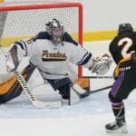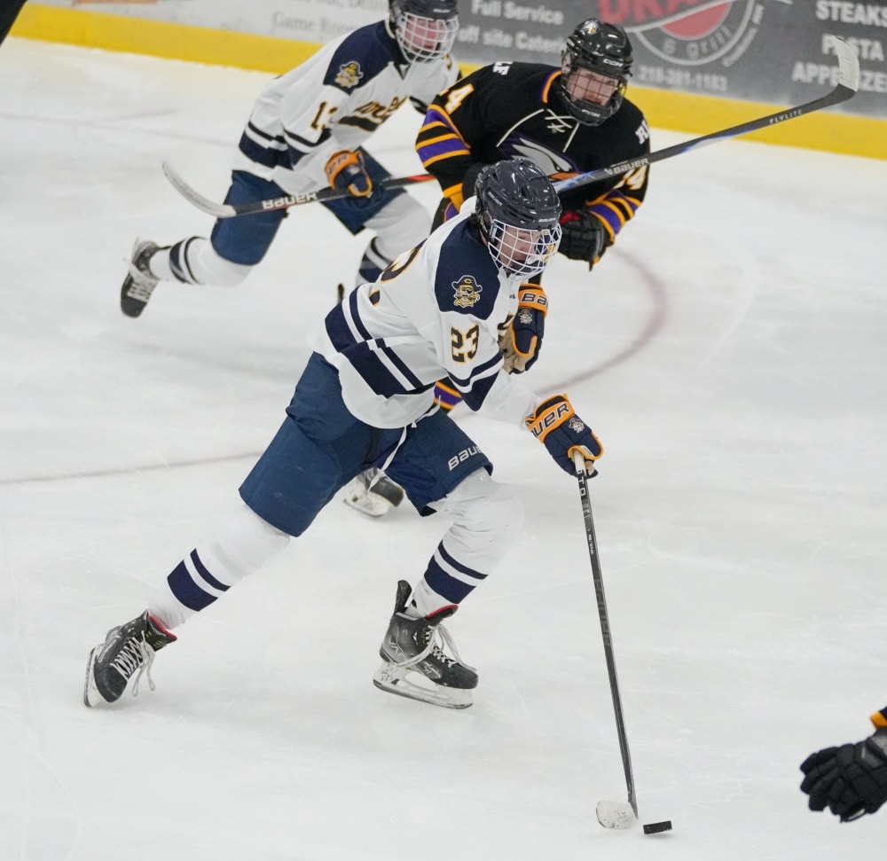Red Lake Falls started the game strong and dominated play right away. They peppered the Crookston goal with shots, and 4:43 into the game, Oliver Melin got a rebound and slapped it into the net to give Red Lake Falls a 1-0 lead. Red Lake Falls had eight of the first nine shots on goal and were controlling play. Crookston started to settle about halfway through the period and turned the tables as they started to control play and outshot the Eagles 11-5 the rest of the period. Red Lake Falls, behind the stellar play of the senior goaltender Draven Wirth and the Eagles, to a 1-0 lead into the first intermission. Crookston took a penalty as the period ended, giving Red Lake Falls a power play to start the second period.