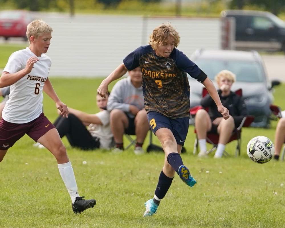 Crookston and Fergus Falls were very evenly matched and that was evident early into the game. Crookston was going into the wind in the half, but still managed to play even with Fergus Falls. Both teams controlled play for a few minutes and the other team would counter in an entertaining first half of play. Crookston had a couple of high quality chances but didn’ t find the net, while Fergus Falls had a couple of quality scoring chances and Pirate goalie Reggie Winjum came up with some solid saves. Both teams had several shots that sailed over the net or wide of the net and either team scored in the first half and it was scoreless going into halftime. “We had a few looks and couldn’t put anything on goal and when we did get shots on goal it was right at their goalie,” said Pirate Coach Lon Boike. ‘”Reggie made some nice saves too. We told the guys to keep pushing the ball down the field and keep working hard in the second half.”