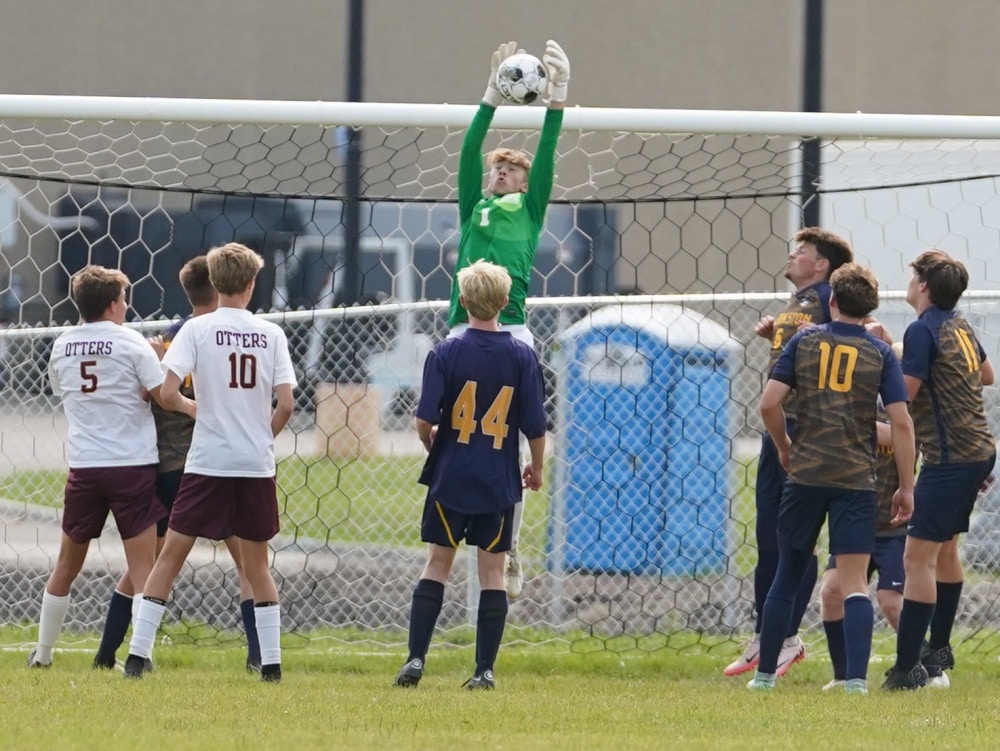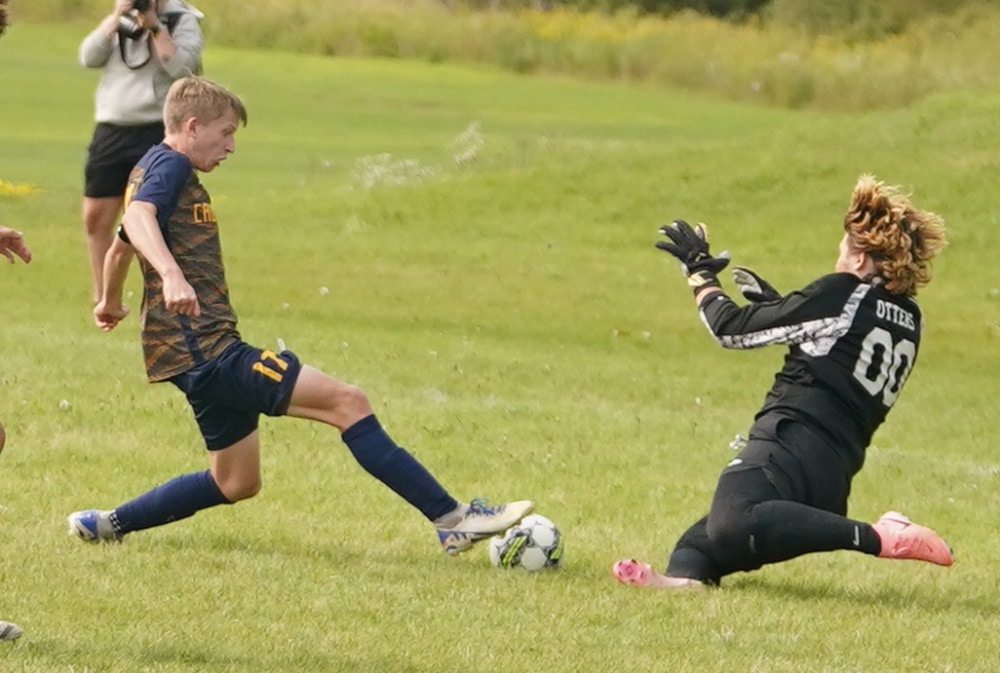 Fergus Falls controlled play for most of the first 10 minutes of the half before Crookston’s Jack Everett put a shot on goal 11 minutes into the half, but the Otter goalie made the save. Crookston started to put some pressure on the Otter defense for the next 10 minutes and had a few shots, but couldn’t find the net. A little over halfway through the half, Crookston’s Everett had another shot on goal from about 30 yards out and it went off the upper right-hand corner of the goal and defelected out of bounds. “We just couldn’t find the goal today,” said Coach Boike. “It was a nice shot and unfortunately we just missed.” The already short-handed Crookston had their leading scorer Brandon Colborn check out because of an injury and one of their top defenders, Peter Wiersma was dinged up and had to check out. Just a few minutes later, Crookston let a Fergus Falls player sneek behind the defense and the ball was kicked towards the net and the Otters Aiden Schake kicked the ball over the Pirate goalie on a perfectly placed kick to score the first goal of the game with over 15 minutes remaining. “We had a little miscommunication on that play,” said Coach Boike. “He made a nice play and just got the kick off and chipped it in.”