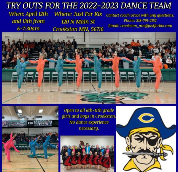 The Crookston Pirate Dance team will be holding tryouts and all girls and boys currently in grades 6 – 11 can try out for the Pirate program.