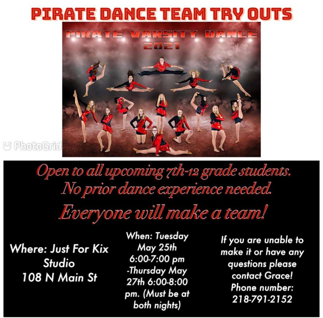The Crookston Pirate Dance team will have tryouts on May 25 and 27.