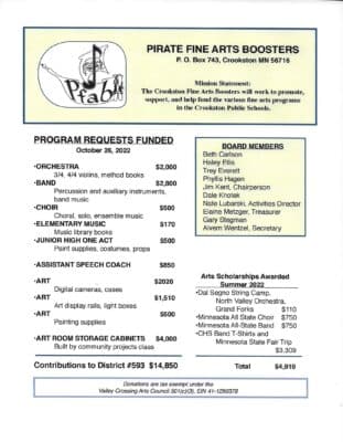 The Crookston Pirate Fine Arts Boosters will issue over $14,000 in grants to Fine Arts programs thanks to their summer fundraising letters and the June Shaver Trust fund.