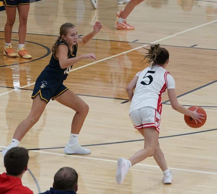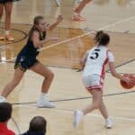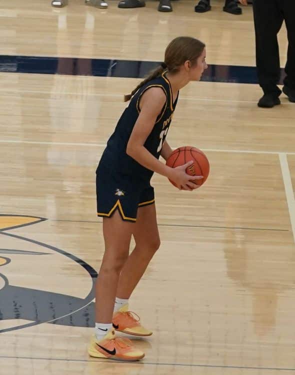 As the game started, the trend of the game became very clear; consistent fouls and turnovers would slow the pace. The game started very messy, with the Mustangs having a 3-2 lead with 3 minutes already past in the half. Then, both teams began exchanging baskets and free throws until the Pirates had an 11-10 lead, after a 3-pointer from Halle Nicholas. After that, the Mustangs took off on a 9-0 run to go up 19-11. The Pirates would continue to claw back, getting 3-pointers from Grace and Chloe Boll, and many second chances from offensive rebounds from Brooklyn Waldal, but after the Pirates cut the lead down to 26-22, the Mustangs responded with a 10-3 run to take a 36-25 advantage. Though both teams combined for 20 fouls in the first half, there were more free throws missed than made, which kept the gap around the same number for the rest of the half. Ultimately, the Pirates would be trailing 42-35 as the game went into the halftime break.