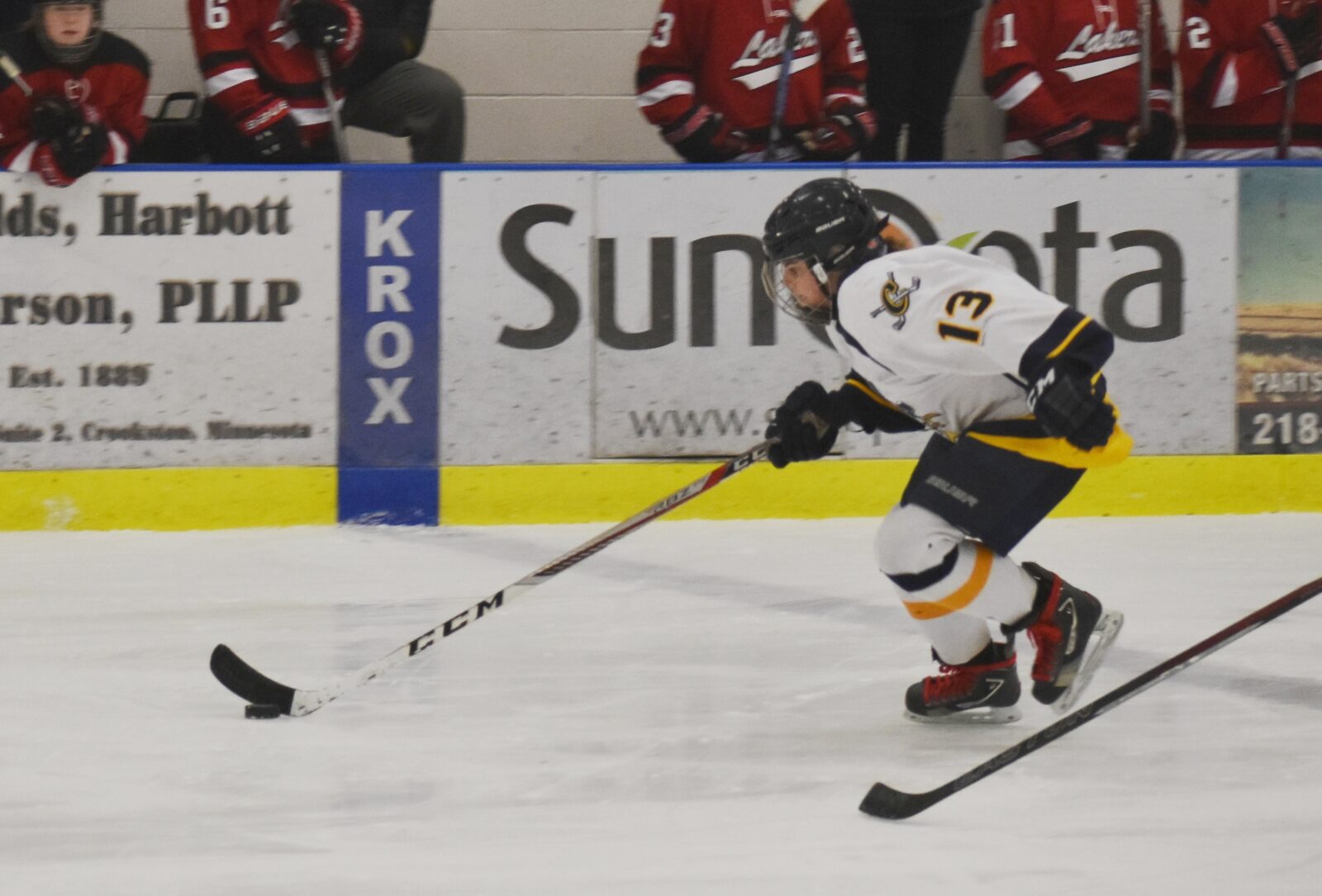In the second period the Lakers kept up the pressure outshooting Crookston 17-3. Detroit Lakes their superior speed to create several rushes up ice, and then were able to maintain the offensive zone for long stretches but couldn’t beat Koshney. “For the most part I thought all game we did some nice things offensively,” said Moe. “We’re just not strong enough and skilled enough yet to sustain a lot of pressure in the offensive zone. I thought we had some nice opportunities, and eventually we’ll score those. But what I’m most interested in is are we in the right positions and doing things the right way and for the most part we’re starting to figure that out.”