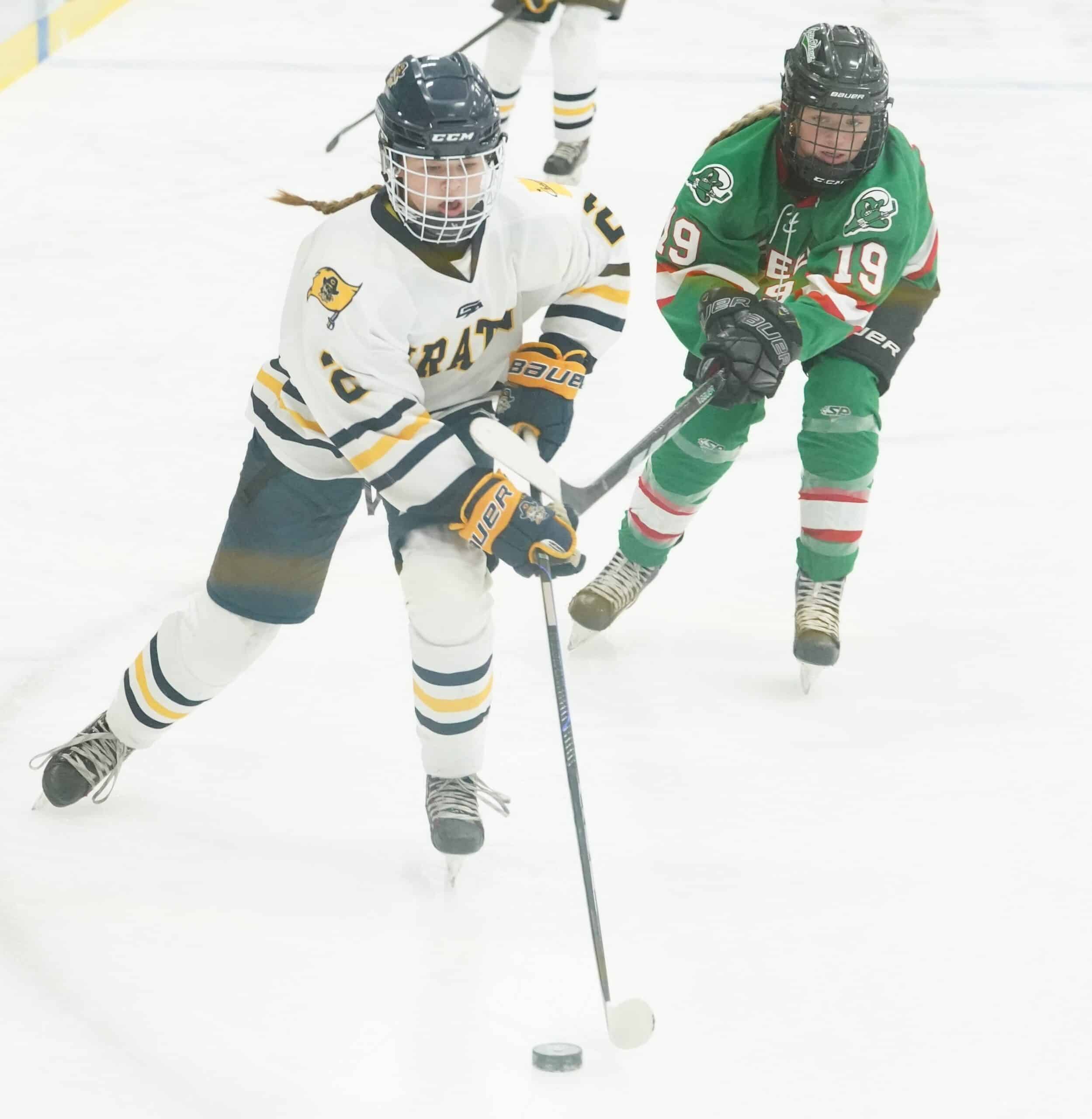 Crookston struck early in the game when junior Emma LaPlante continued her scoring prowess scoring her fourth goal in the last two games when she worked her way in close to get a forehand shot that was blocked by the East Grand Forks goaltender, Britlyn Rasmussen and went up and over the goalie and at first it was in the blue in the crease and the official emphatically waved it off, but the puck get rolling and then was ruled a goal and the Pirates led 1-0 just 2:12 into the game. “It was a good start for us and important to get that first goal,” said Crookston head coach Reed Olson. The rest of the period, both teams had opportunities but didn’t cash in. The Green Waves Sophia Lukach had an outstanding chance by carrying a puck into the Crookston zone, turned around a Pirate defenseman and was in alone and made a move that had Crookston goalie Kamebelle Freije took the fake and was down and left her left side wide open, but Lukach started losing control of the puck and instead of putting into the net, she hit the side of the Pirates net and kept the score at 1-0. “We seemed to let off the gas after we scored the first goal,” said Crookston coach Olson, “we’ve had a tendency to do that and we have to figure out that we can’t do that, we have to keep the foot on the gas.” Shots were fairly even in the period, which senior Britlyn Rasmussen recorded her 1,000th save of her career.
