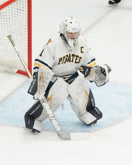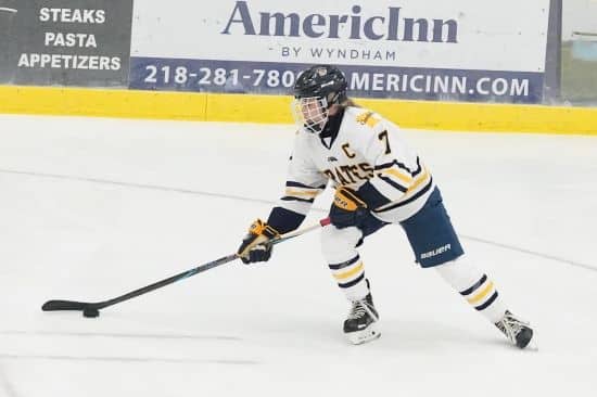 Penalties dominated the second period, which threw everything off track. Both teams had four-on-four and five-on-fours, but nobody could score. Crookston had several great chances by a handful of players throwing 14 shots on goal, but Mara Pelland, the senior goaltender for International Falls, was stellar, grabbing shots with a good glove and quick on her feet. “Their goalie played well,” said Olson, “in some instances, we made her look good, but she is a veteran who has seen a lot of shots over the years.” The Broncos did get four shots on the Pirates goalie, Kamebelle Freije, but nothing in the challenging variety. International Falls had to feel pretty good going in the second break. Crookston did not, as their outstanding freshman defenseman, Adley Vigness, was working the puck at the International Falls blue line, and she backed into the Broncos zone and was hit and went down and couldn’t get up as one of her ankles suffered an injury that took her out of the game.
