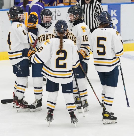 The Crookston Pirate Girls Hockey team scored six goals in nine minutes of the third period to blow open their game with International Falls in an 8-0 win at the Crookston Sports Center. Crookston led 2-0 after the first period but were scoreless for the next 23 minutes. After the coaches talked about playing more unselfishly in the third period..Crookston outshot the Broncos 56-8 in the game and the senior goalie registered her second shutout of the season, breaking that Crookston school record of 14 shutouts in her career!