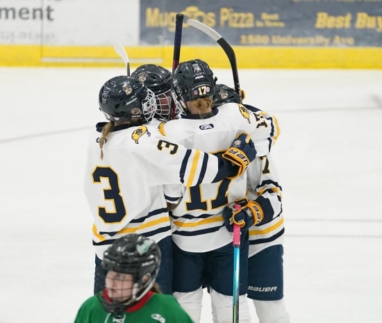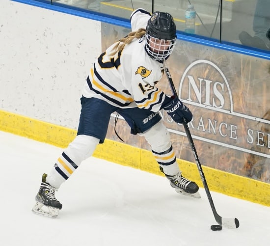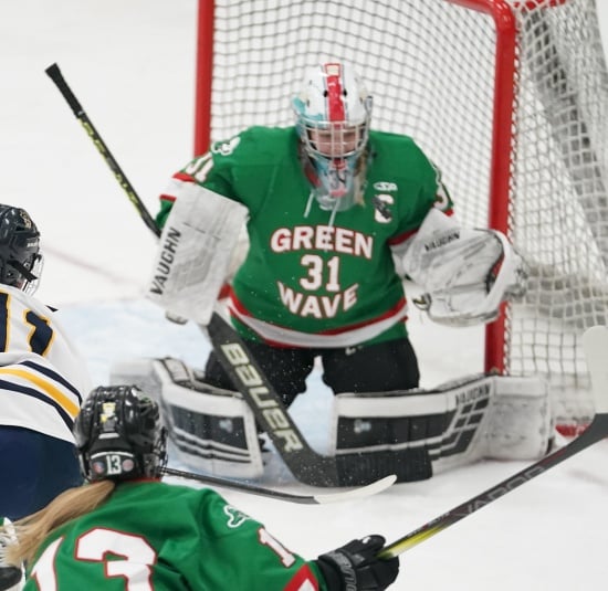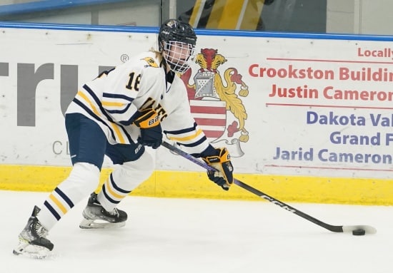 Crookston dominated from the opening faceoff in the first period. Although they did not score on three power play opportunities, they controlled the offensive zone for most of the period. The Pirates got on the board when their junior leading scorer, Addie Fee, was working behind the Green Wave net and walked out to the right side of East Grand Forks goalie Britlynn Rasmussen and, from a bad angle, shot. It went off Rasmussen’s shoulder and stuck there until she moved her head, and the puck trickled off into the net to give Crookston a 1-0 lead eight and a half minutes into the game. Fee said, “I was just trying to put it on the net, and it ended up hitting her head and going in.”  The important thing was giving Crookston a lead to start it off. “It was a big goal to get that first one,” said Crookston head coach Emily Meyer (listen to her post-game interview below), “it was a crazy one that Addie put it off their goalie’s shoulder, and it seemed to bounce off her helmet into the goal.”  Crookston would have three power-play goals in the period and be unable to score on any Green Wave penalties! The Pirates outshot East Grand Forks 17-3 in the period but only a 1-0 lead. “We liked the way we played in the first period,” said Coach Meyer, “we controlled things with a lot of time in the offensive zone, got back when we had to play defensively, and then we had Kamebelle back there. We told them to go out and do the same thing in the second period.”