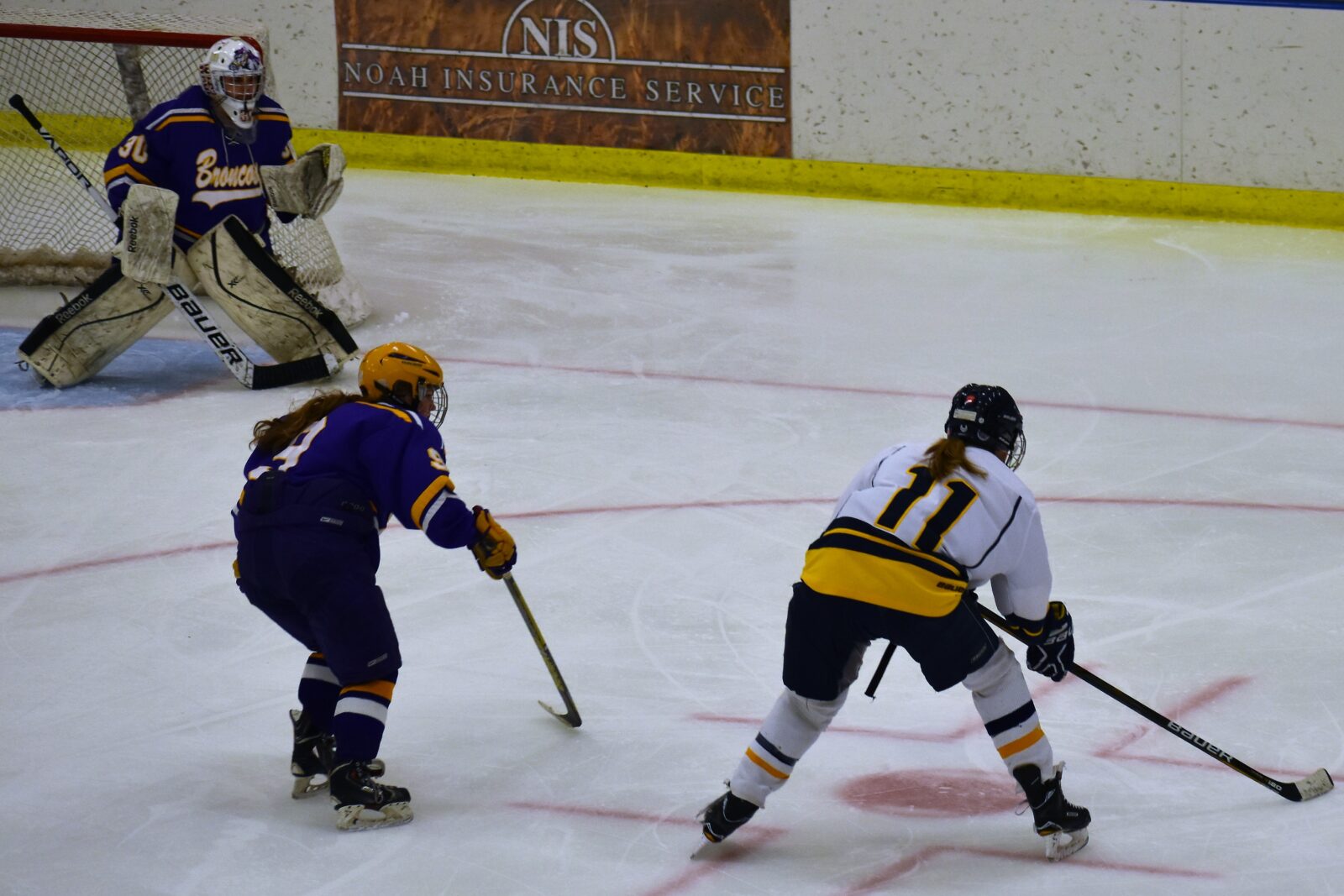 The Pirates didn’t generate much offense during the first period only getting three shots on goal, but they would get the only goal of the period when Catherine Tiedemann found Nora Peterson streaking up ice and Peterson beat the goaltender to the glove side for a 1-0 lead with 2:26 to play.  “Overall we got outplayed in the first period coming off a JV game where everyone had to play and then having a bit of a break waiting for the boy’s game to end,” said Pirate coach Tim Moe.  “Catherine found Nora streaking down the ice and that’s something we’ve talked about that with their skill level they have to find openings and trust the other one is going to get it to them. Nora did a fantastic job breaking around the defenseman and deking the goaltender.” Grace Koshney was perfect in net stopping all 14 Broncos shots in the first period.