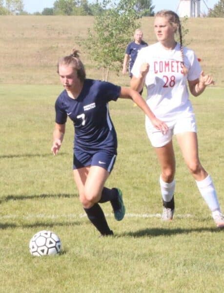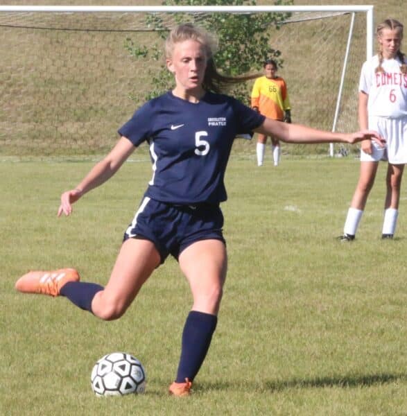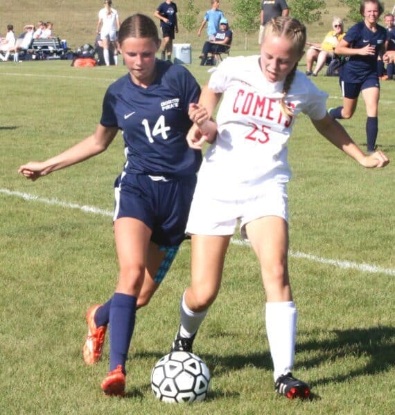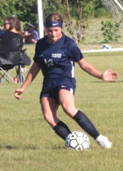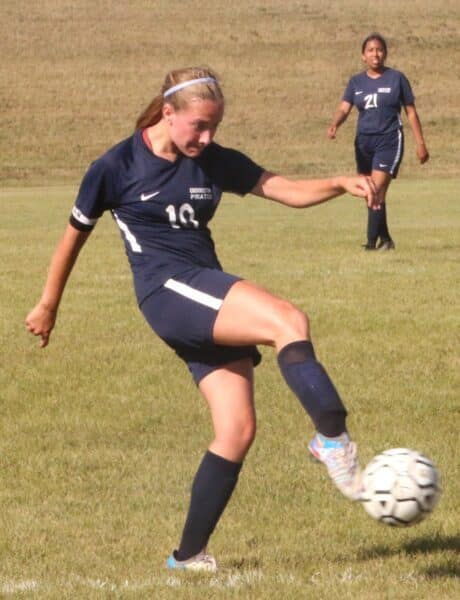 The second half started back and forth with no teams getting sustained pressure on net. “We would have burst of offense, and then we would be a little on the backs of our feet, and then we’d have another burst.” said Coach Reese. During those offensive bursts, the Pirates utilized those corner forwards and multiple players were getting shots on net from both sides of the field. The Pirates would be rewarded for their persistence when a Joslyn Wallace freekick would find Cassie Solheim, who would turn towards the net, beat her defender, and would beat the keeper to make this a 2-0 game. That goal proved to be a pivotal one, as less than a minute later, the Comets would quickly move down field on the attack. The Pirates seemed to be caught on their heels as the Comets centered the ball and Emma Rademaker was able to beat Swanson to get the Comets back within one. After the Comet goal, Reese Swanson made a huge save on a Comet who broke from the defense, by running up and not being afraid of contact to grab the loose ball to keep the score at 2-1. “Reese Swanson had a stellar performance, and frankly there was a couple opportunities where she saved us.” said Coach Reese. The Pirates would step up their defense to prevent the Comets from tying up this game. “We have to work together, and be gritty at those last six to seven minutes,” said Coach Reese, “and we played smart soccer at the end.”