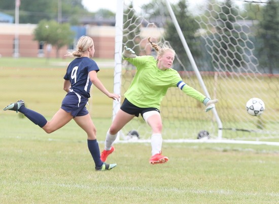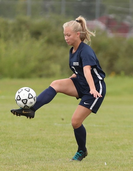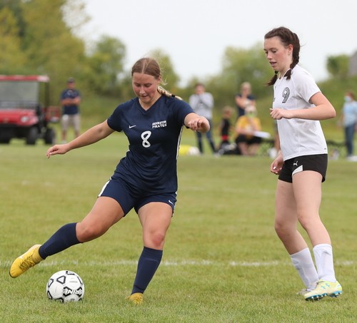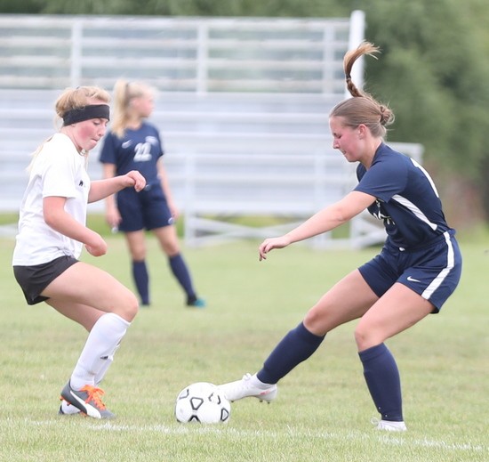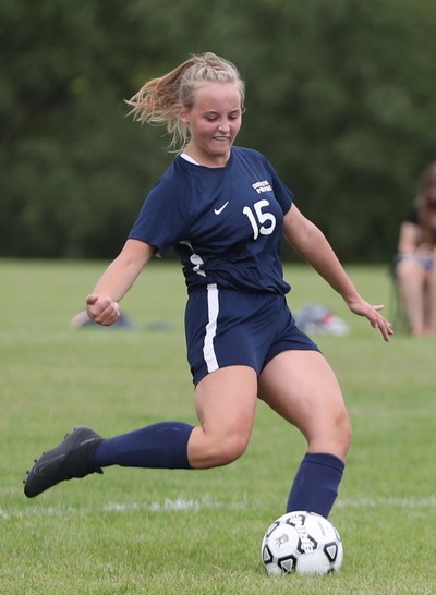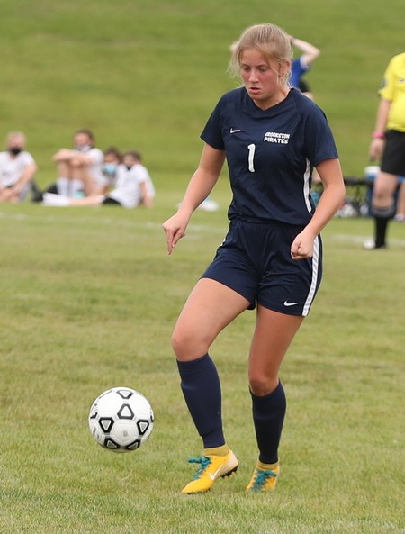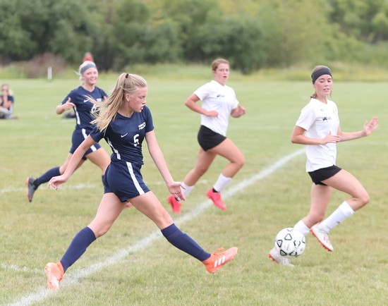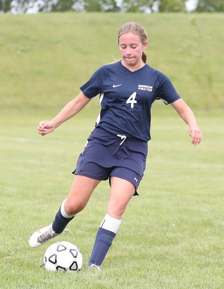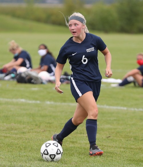 Crookston came out strong to start the game when Kenze Epema kicked the ball on a cross pass and Cassie Solheim scored from about six feet out for a 1-0 lead 82 seconds into the game. Crookston added another goal a little over 11 minutes later when Olivia Huck delivered a perfect pass across midfield and Epema caught up with the ball with nobody around her and put the ball in the net for a 2-0 lead. “It was a breakaway,” said Epema. “It wasn’t a beautiful shot, but it went in and I was glad.” Less than three minutes later the Pirates struck again with Clara Meyer taking a pass on the left side of the net and kicking it into in the lower corner for a 3-0 lead. “I have been working on my kicks a lot. During quarantine, after the snow melted, I went out to UMC and kicked a lot and I worked on it a lot this summer,” said Meyer. “I went to FAST this summer and worked out with the girls hockey team and that really helped.” Neither team scored in the final 24 minutes of the half and Crookston took a 3-0 lead into halftime. “