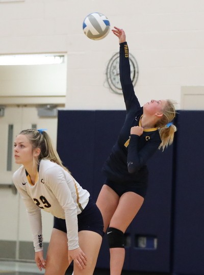 Crookston started the match going on a 4-1 run with one of the points coming off a Kasey Cwikla kill. “We were loud early,” said Pirate Coach Ashley Stopa. “We were talking and came out with some energy.” NCE/UH battle back to tie the match at 6-6 taking advantage of a couple of Pirate service errors. Halfway through the set, NCE/UH had a 12-10 lead and went on a 5-1 run behind kills from Brianna Thompson Corie Peterick for a 17-11 lead. The Titans continued to pull away with some nice kills from Madison Thornton and cruised to a 25-15 victory to take a 1-0 lead. “We struggled on our serves and hit them too hard,” said Coach Stopa. “We were moving well but struggled hitting the ball. I think in general we got too excited and hit the ball too hard.”