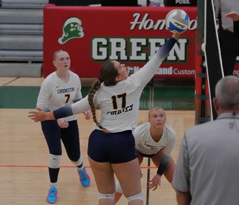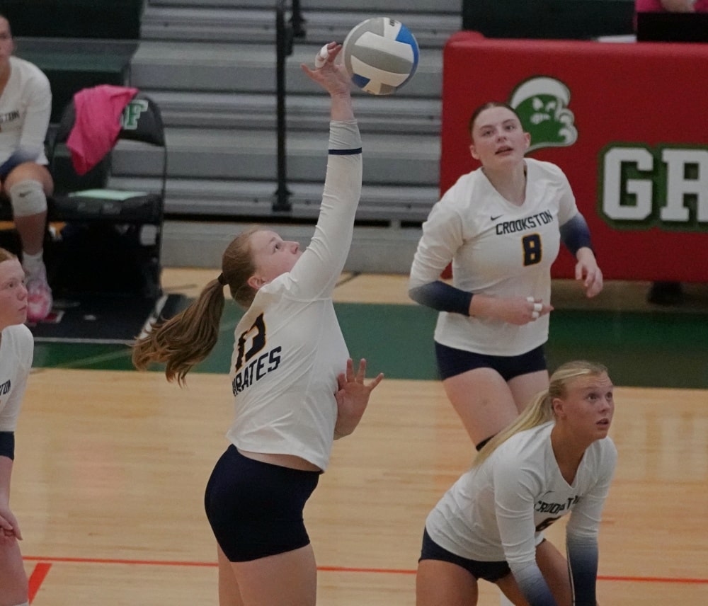 East Grand Forks jumped out to a 7-1 lead that started with two Crookston errors, a Kleinvachter ace, a Crookston serve in the net, an Emma Pieper ace, and kills from Brooke Hecht and Tatem Votava. EGF served out of bounds, and Crookston followed with the same error for a 8-2 Green Wave lead. EGF went on a 6-1 run starting with a Laurel Kolstoe ace, kills from Hams and Votava, two Splide aces, and a Kleinvachter kill for a 14-3 lead. Crookston’s Abigail Bruley had a kill before two serves in the net and another Bruley kill to get within a 15-6 deficit. EGF ended the set on a 10-3 run and won 25-9. Crookston had four errors in the run while four different Green Wave players had kills.