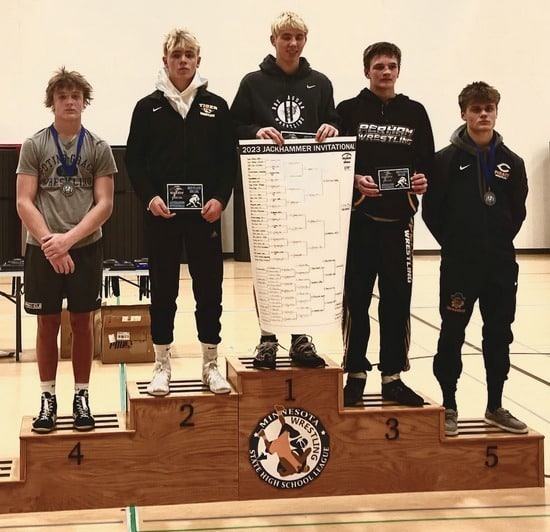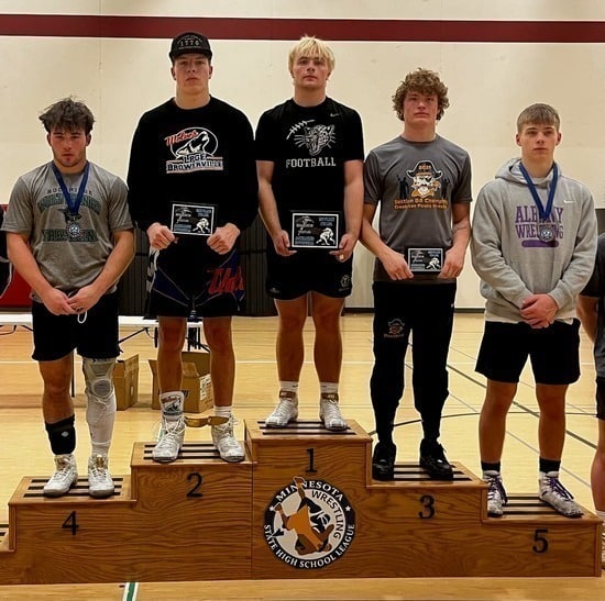 At 285 pounds, Riley Helgeson started with a bye before losing to Paynesville’s Kevin Raya Botello by a pin in 1:24. In the consolation bracket beat Hutchinson’s Kyler Haugen by a pin in 1:58. In the next round, Helgeson beat the #7 ranked Harley Weber out of Belgrade/Brooten/Elrosa in an Ultimate Tie-breaker 4-3. Helgeson then lost Millie Lacs’ Brodie Kuhlman ina  5-4 decision. In the seventh-place game, Helgeson lost to Big Lake’s Trajan Mussehl by a pin in 1:25, giving Helgeson an eight-place finish.