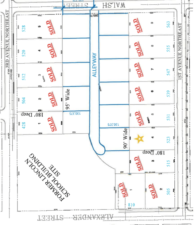 Concept 3 – Plat adjustment and lot expansion. This concept proposes selling or transferring the 95’ x 130’ lots to adjacent homeowners to expand existing yards, add an alleyway, construct a home on lot #523, and fully develop the Lincoln School property.